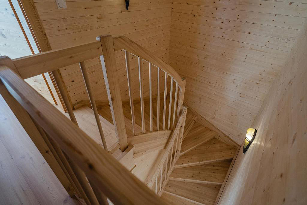 84 m² - 1. podlažie chaletu: obývacia izba s kuchynským kútom a rozkladacím gaučom pre 2 osoby, pec (drevo voľne k dispozícii), predsieň, terasa; 2. podlažie chaletu: spálňa s manželskou posteľou, spálňa s 2 samostatnými lôžkami, sociálne zariadenie, privátna sauna, oddelené WC