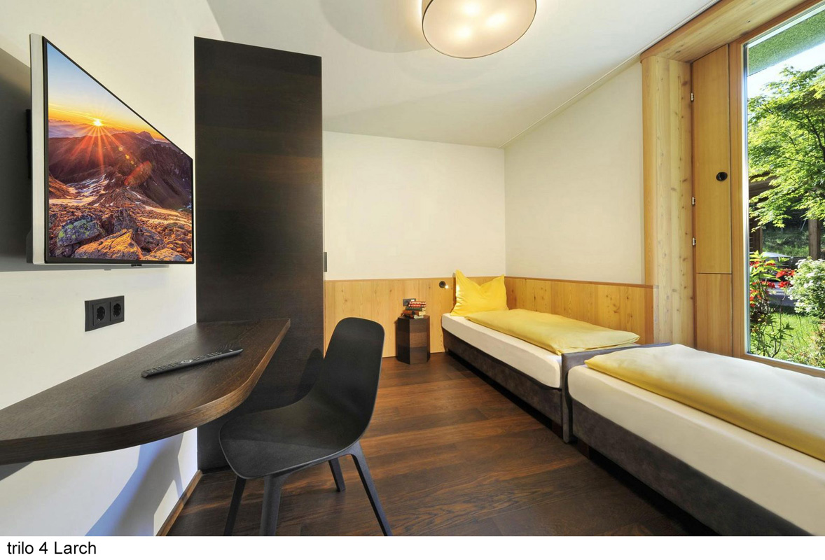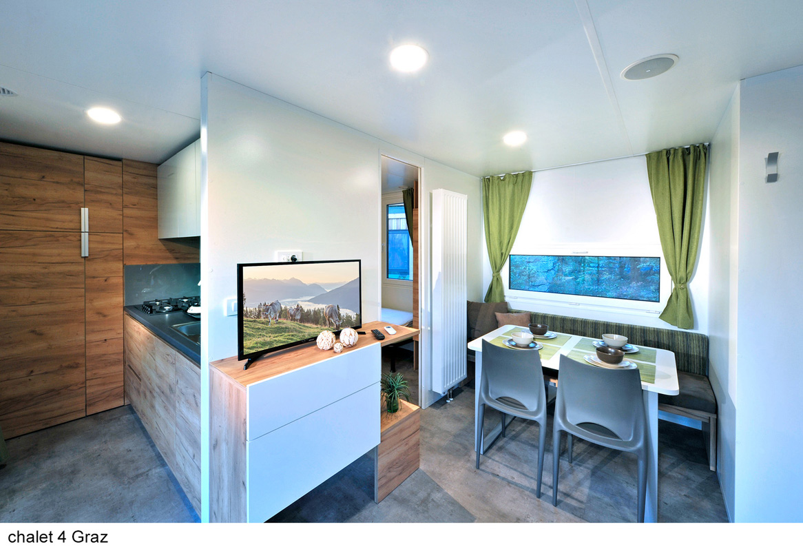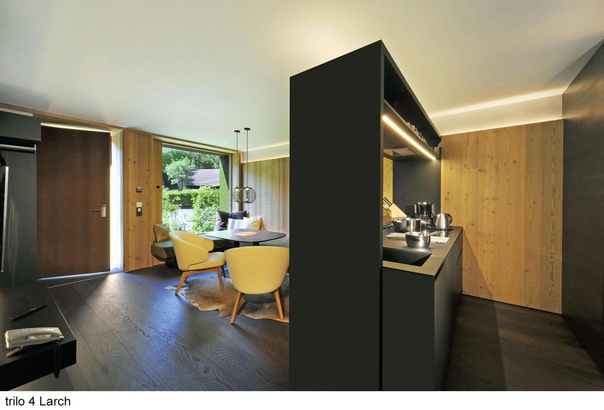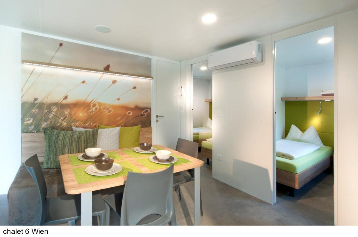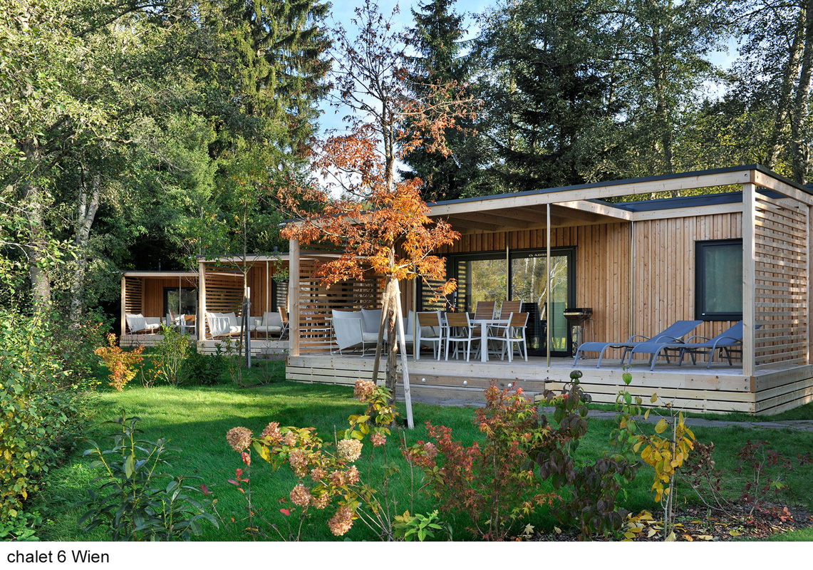 úplne jedinečný ubytovací komplex skladajúci z apartmánových budov s apartmánmi trilo Pine a Larch, mobilehomes resp. chalety Graz a Wien a voľne stojacími drevenými domčekami Tiny home , centrálnej budovy s recepciou, bistrom, terasou, konferenčnou miestnosťou, úschovňou lyží a detskou herňou; uvedené vzdialenosti sú merané od recepcie
