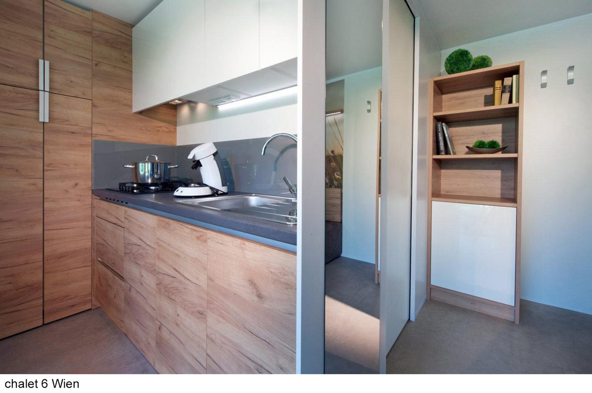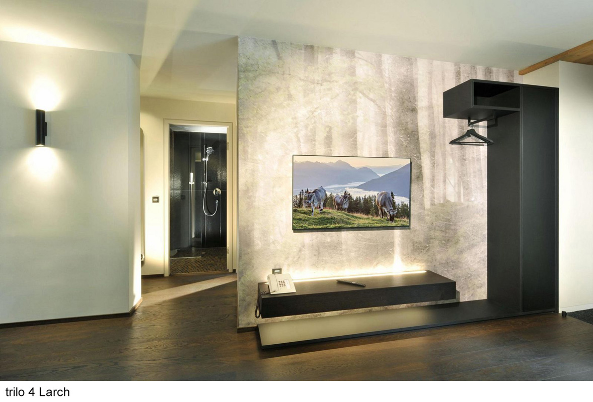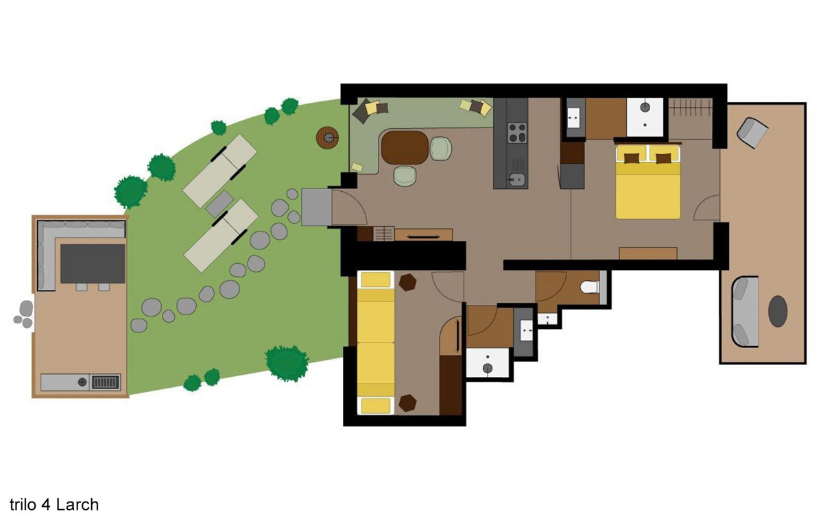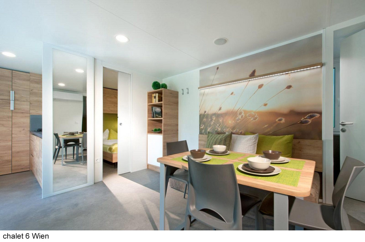 úplne jedinečný ubytovací komplex skladajúci z apartmánových budov s apartmánmi trilo Pine a Larch, mobilehomes resp. chalety Graz a Wien a voľne stojacími drevenými domčekami Tiny home , centrálnej budovy s recepciou, bistrom, terasou, konferenčnou miestnosťou, úschovňou lyží a detskou herňou; uvedené vzdialenosti sú merané od recepcie