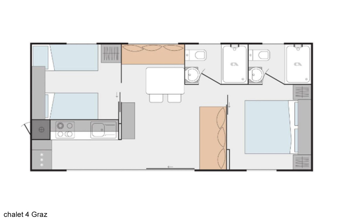 37 m² - 1 spálňa s manželskou posteľou, menšia spálňa s poschodovou posteľou, obývacia izba s kuchynským kútom, sociálne zariadenie, oddelené WC, terasa s predzáhradkou, privátne parkovacie miesto (1 miesto / apartmán)