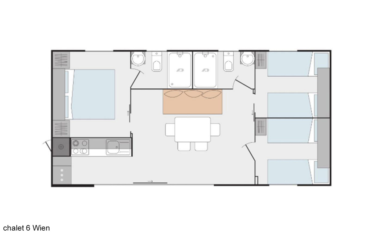 57 m² - 1 spálňa s manželskou posteľou, spálňa s 2 samostatnými lôžkami či poschodovou posteľou, obývacia izba s gaučom a kuchynským kútom, 2x sociálne zariadenie, 1x oddelené WC, terasa s predzáhradkou, privátne parkovacie miesto (1 miesto / apartmán)