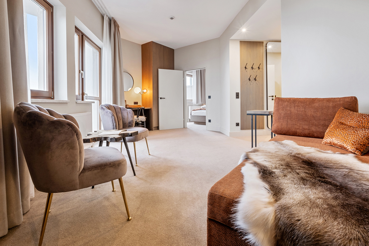 Mansarde 5 - 38 m² - izba s manželskou posteľou, menšia izba s 2 samostatnými lôžkami v neuzatvorenom poschodí prístupnom po schodoch, obývacia izba s rozkladacím gaučom pre 1 osobu, sociálne zariadenie s vaňou, oddelené WC, balkón; izbu je možné obsadiť najmenej 2 dospelými osobami a 2 deťmi; izby neodporúčame pre rodiny s deťmi do 4 rokov (kvôli schodom)