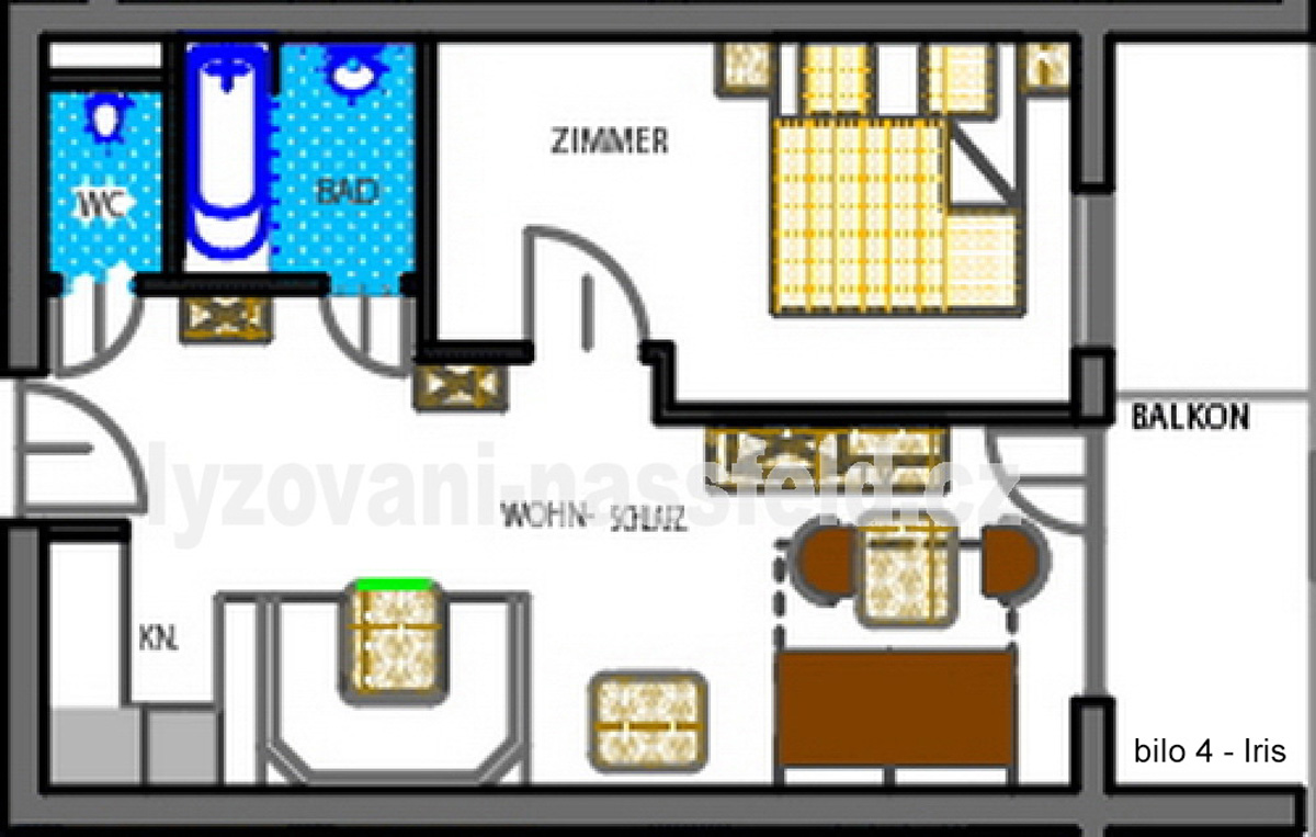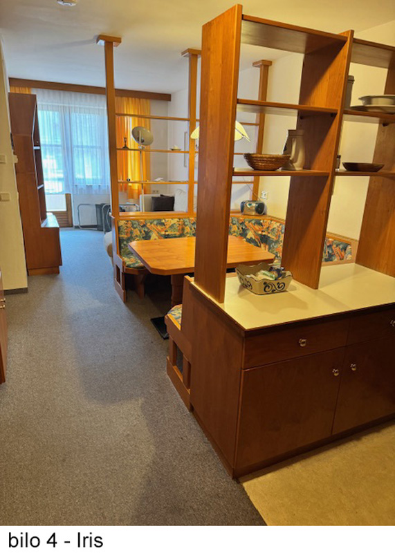bilo 4 Iris - 39 m² - spálňa s manželskou posteľou, obývacia izba s kuchynským kútom a rozkladacím gaučom pre 2 osoby, sociálne zariadenie, oddelené WC, balkón; apartmán je na 1. poschodí
