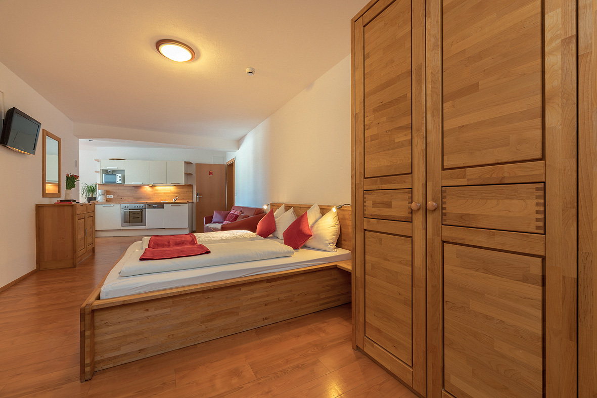 mono 4 - 45 m² - obývacia izba s manželskou posteľou a rozkladacím gaučom pre 2 osoby, opticky oddelená predsieň s kuchynským kútom, sociálne zariadenie so sprchou a vaňou, oddelené WC, balkón v rámci spoločnej terasy s apartmánom bilo 4