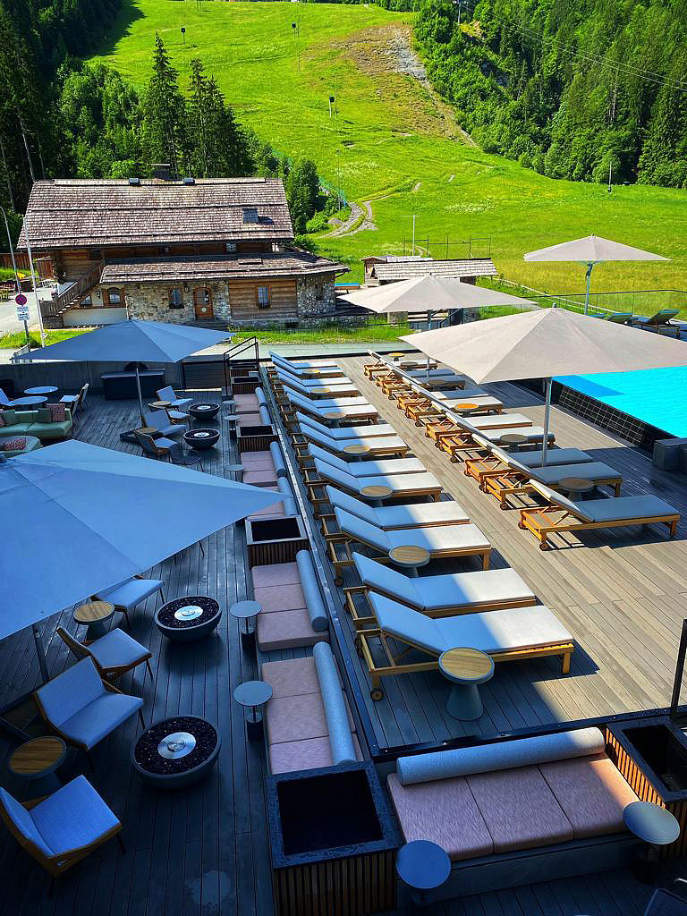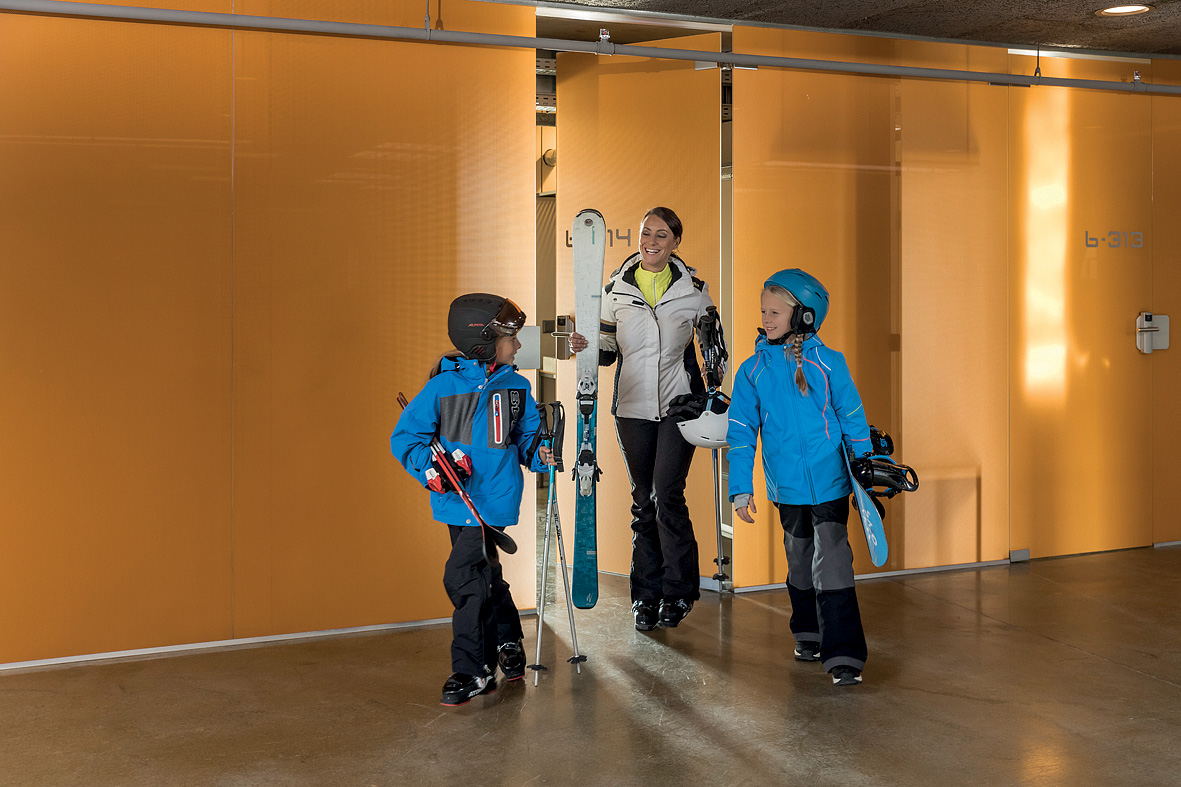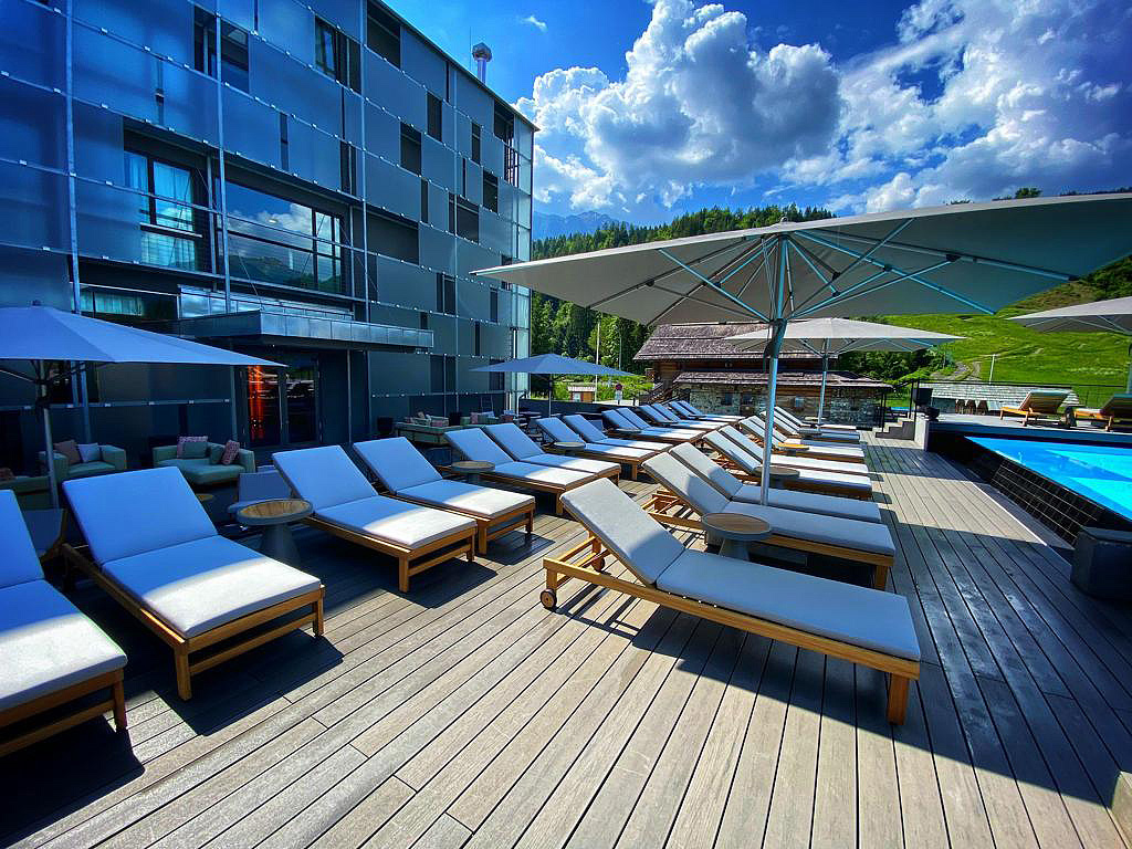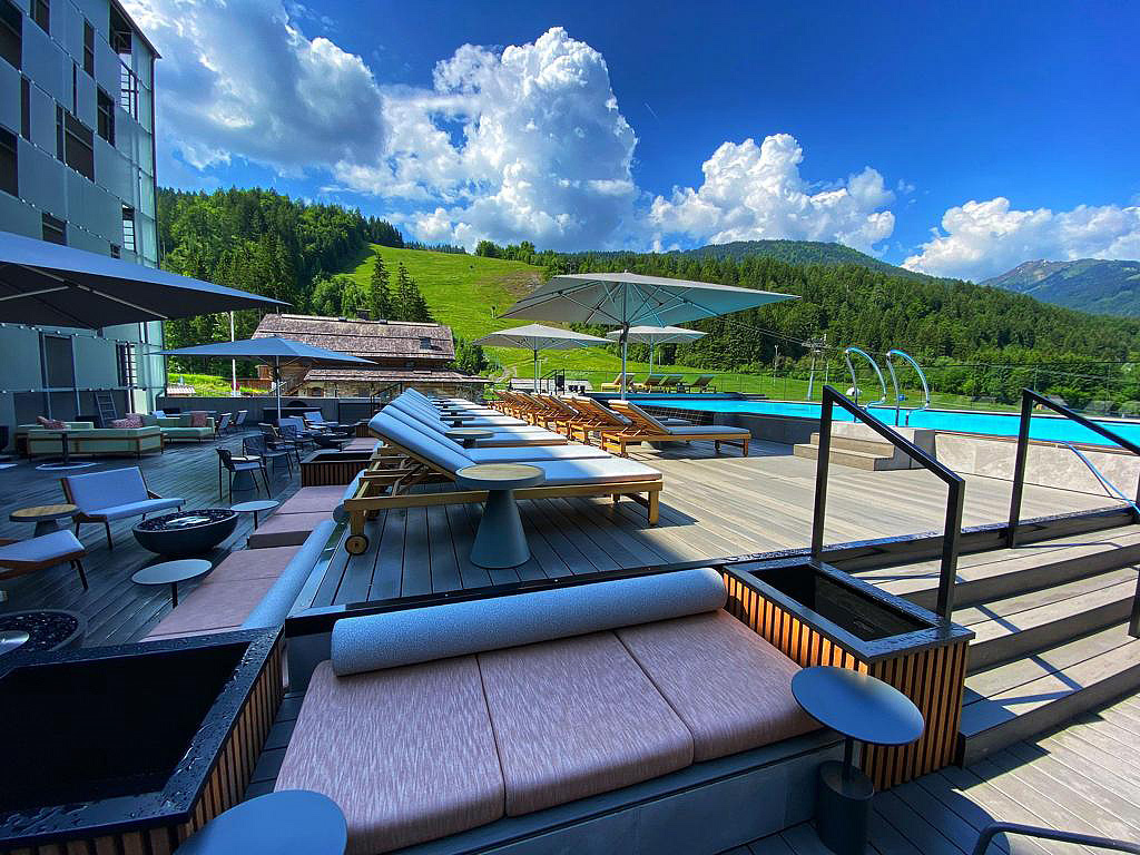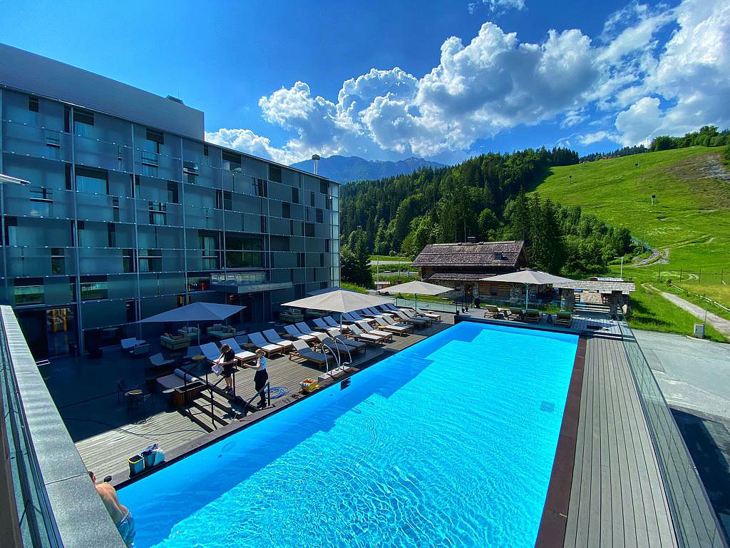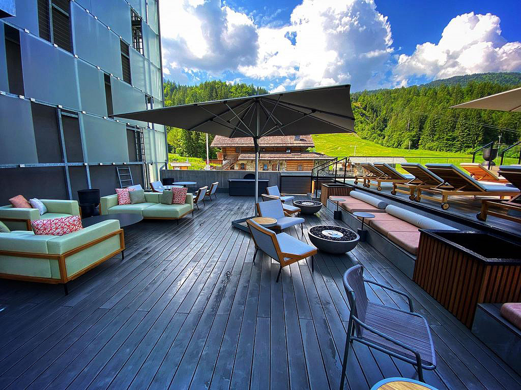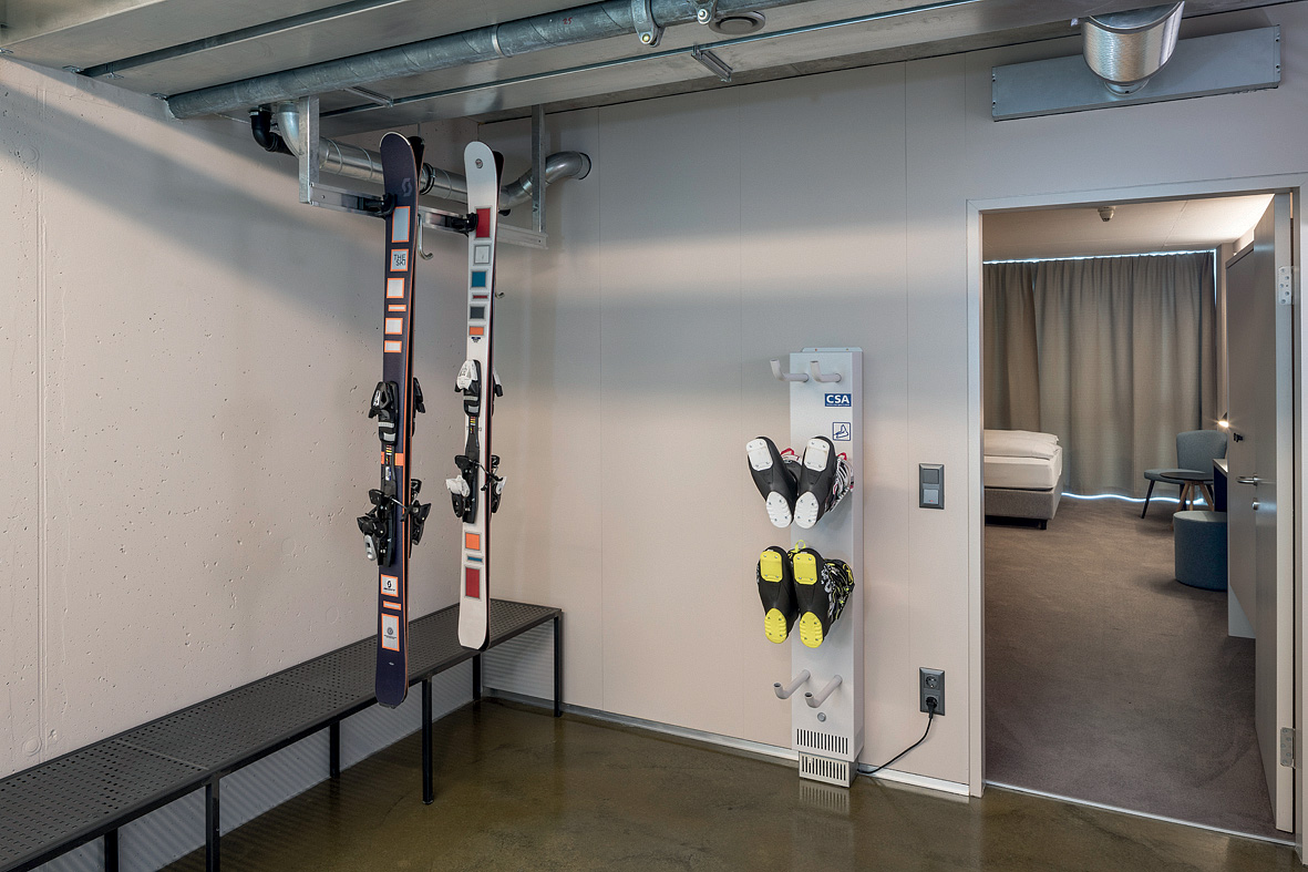 architektonicky zaujímavý hotel pri dolnej stanici lanovky, vonkajší vyhrievaný Infiniti bazén prepojený s vnútorným bazénom a úplne netradične vnútorné rampy a privátny ski depot priamo pred každou izbou
