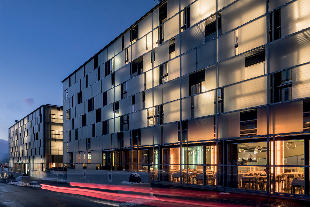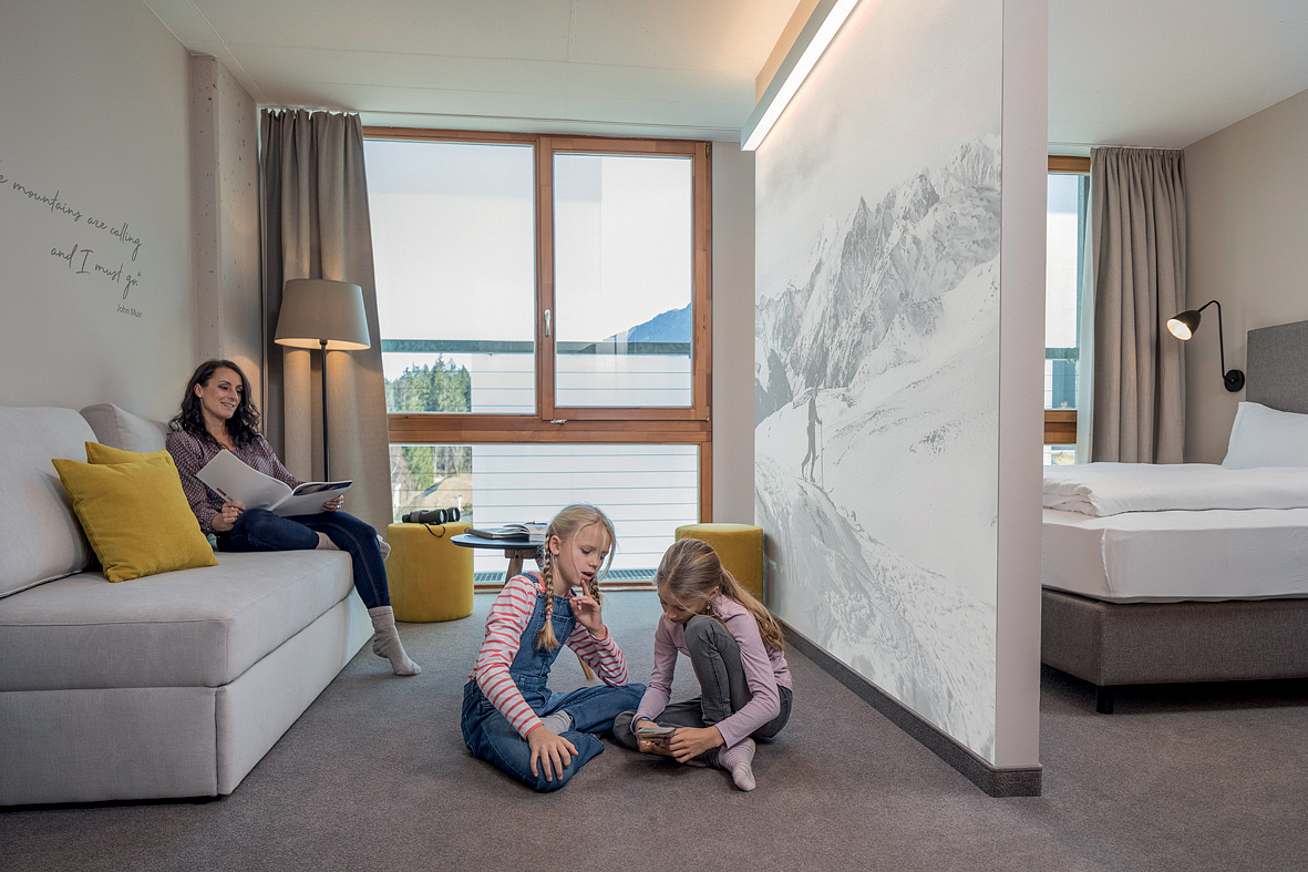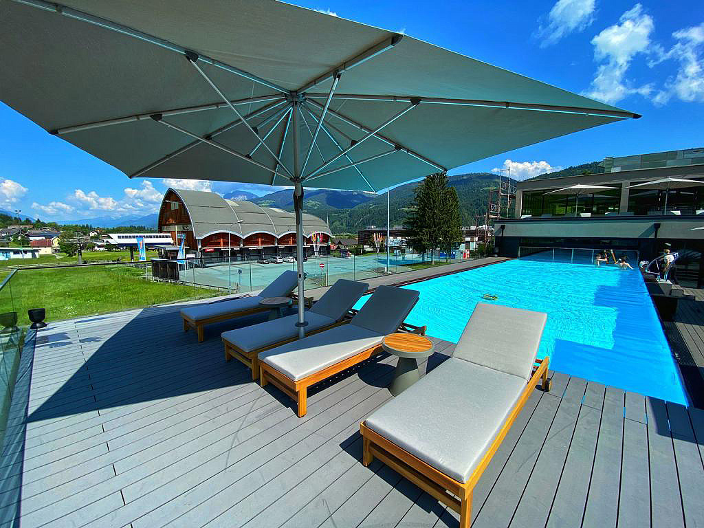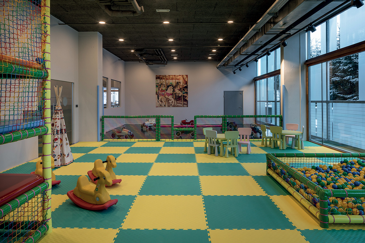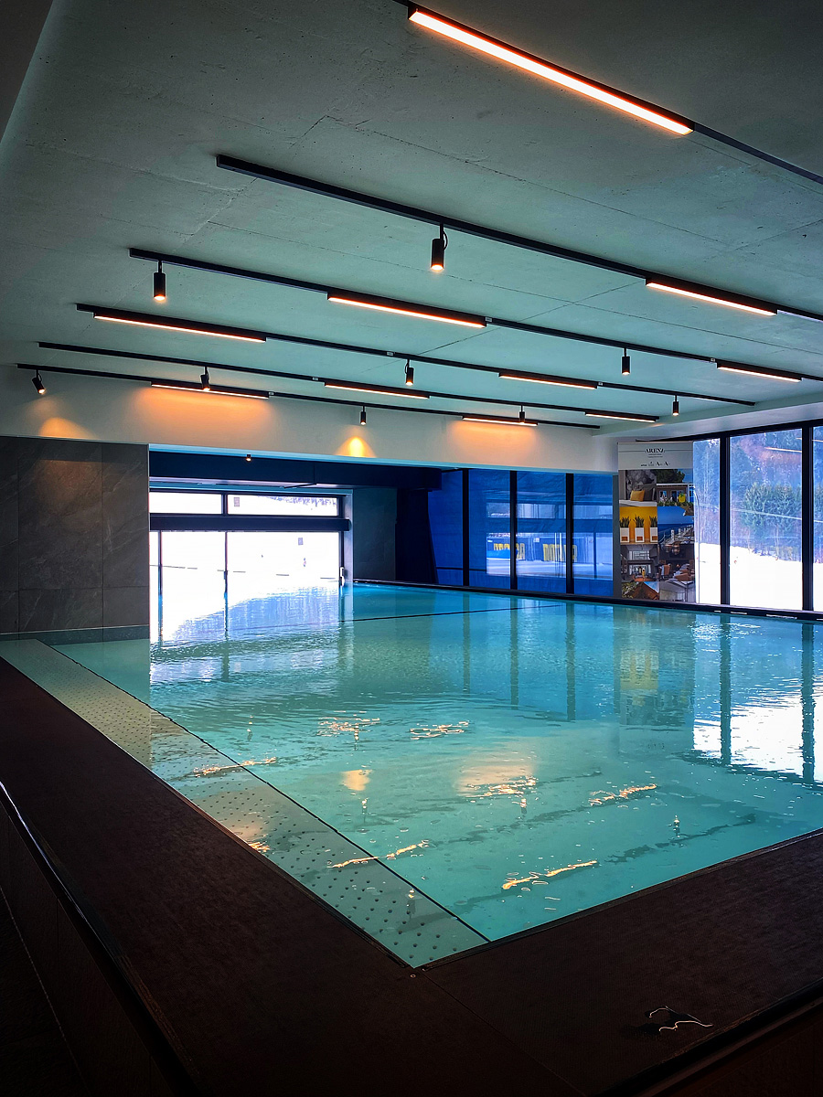 architektonicky zaujímavý hotel pri dolnej stanici lanovky, vonkajší vyhrievaný Infiniti bazén prepojený s vnútorným bazénom a úplne netradične vnútorné rampy a privátny ski depot priamo pred každou izbou