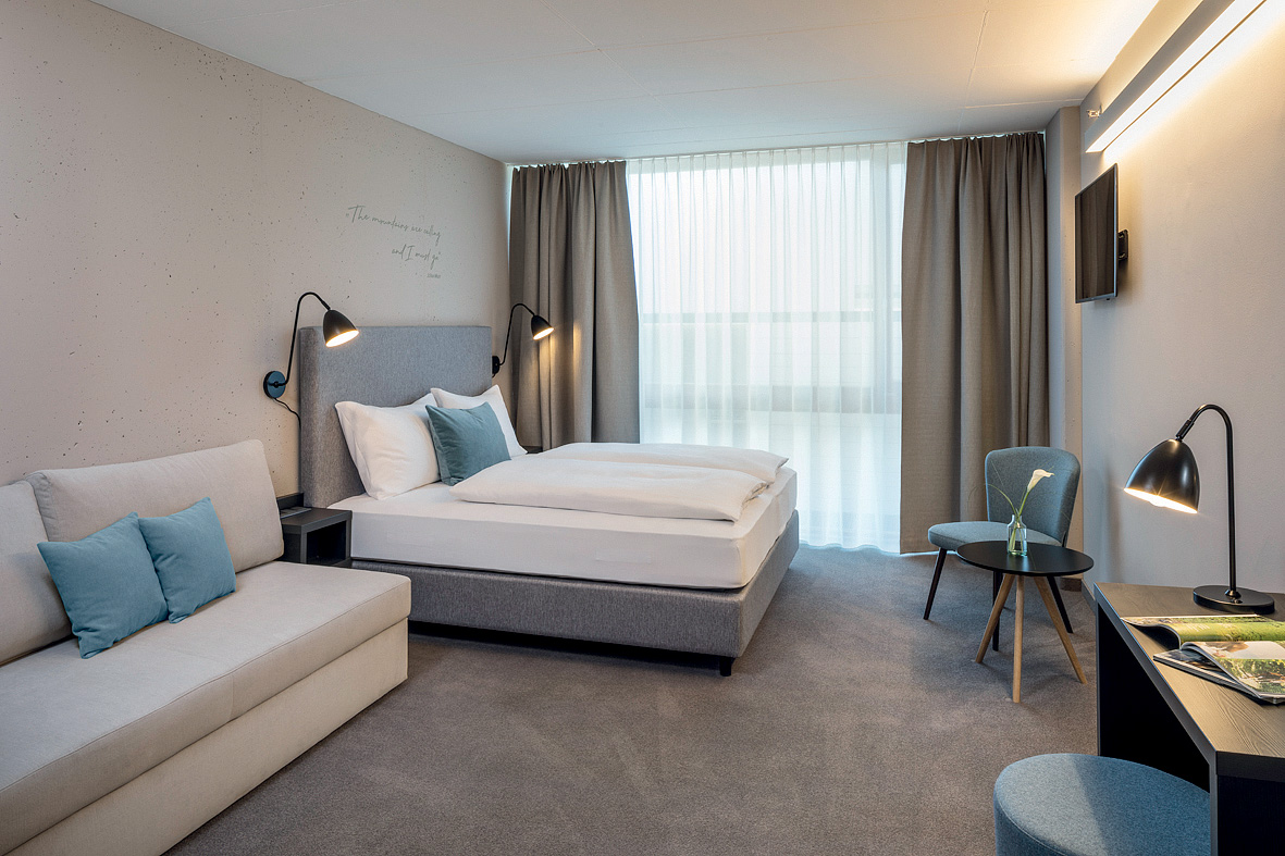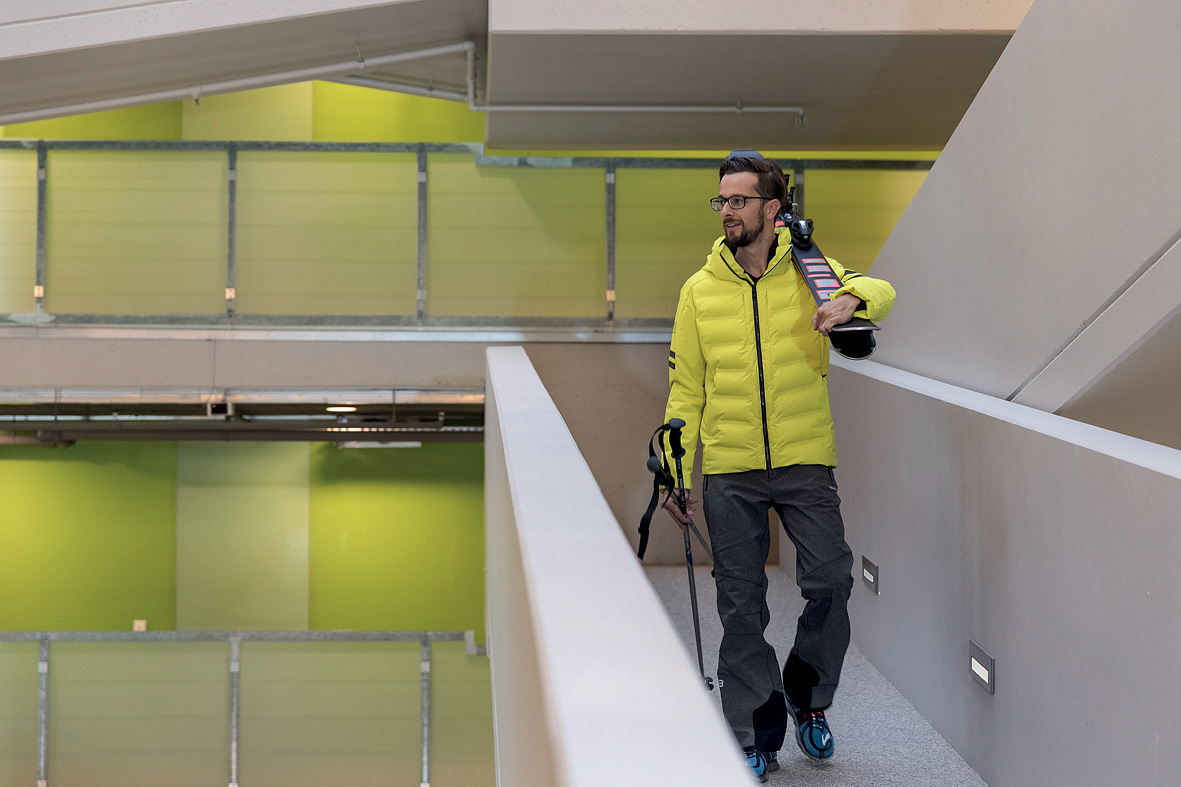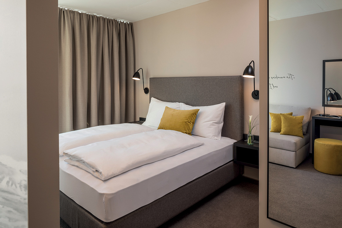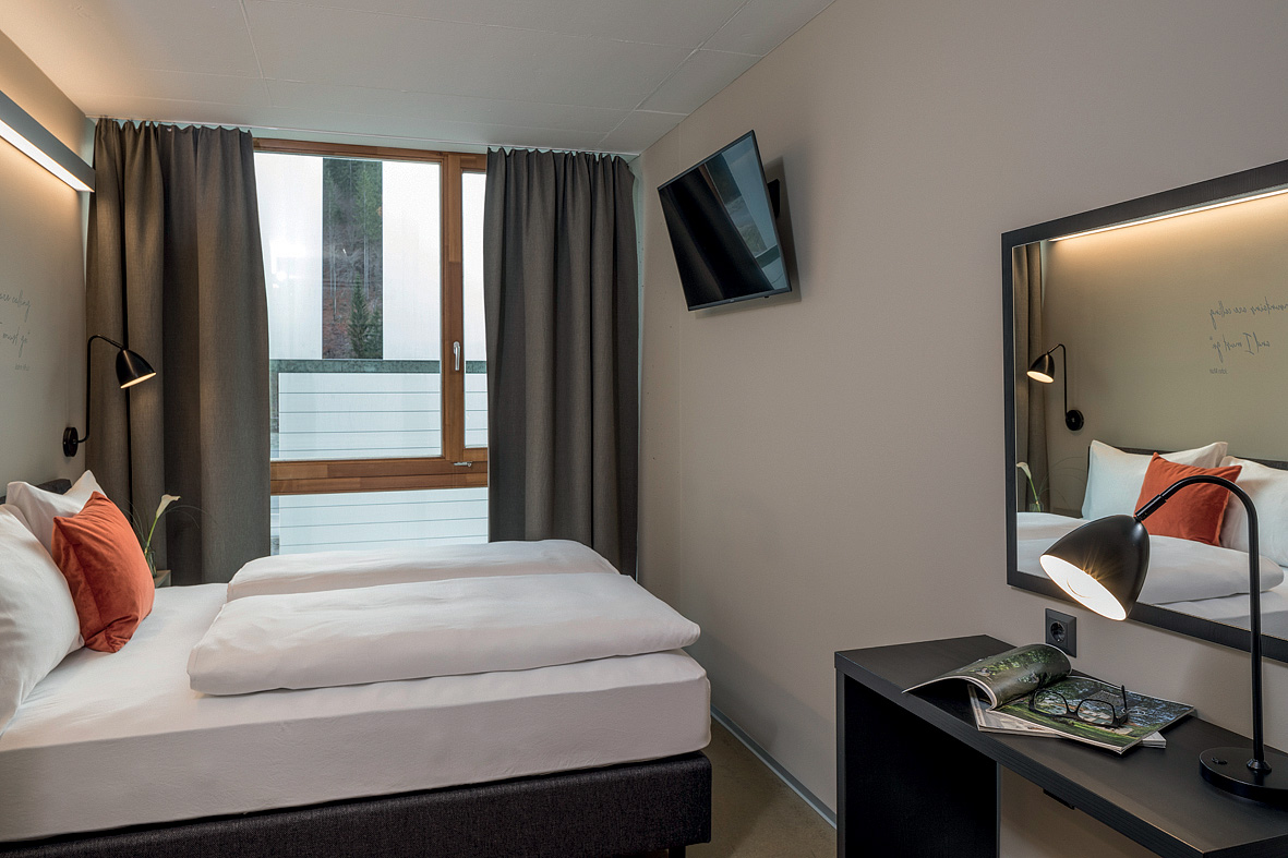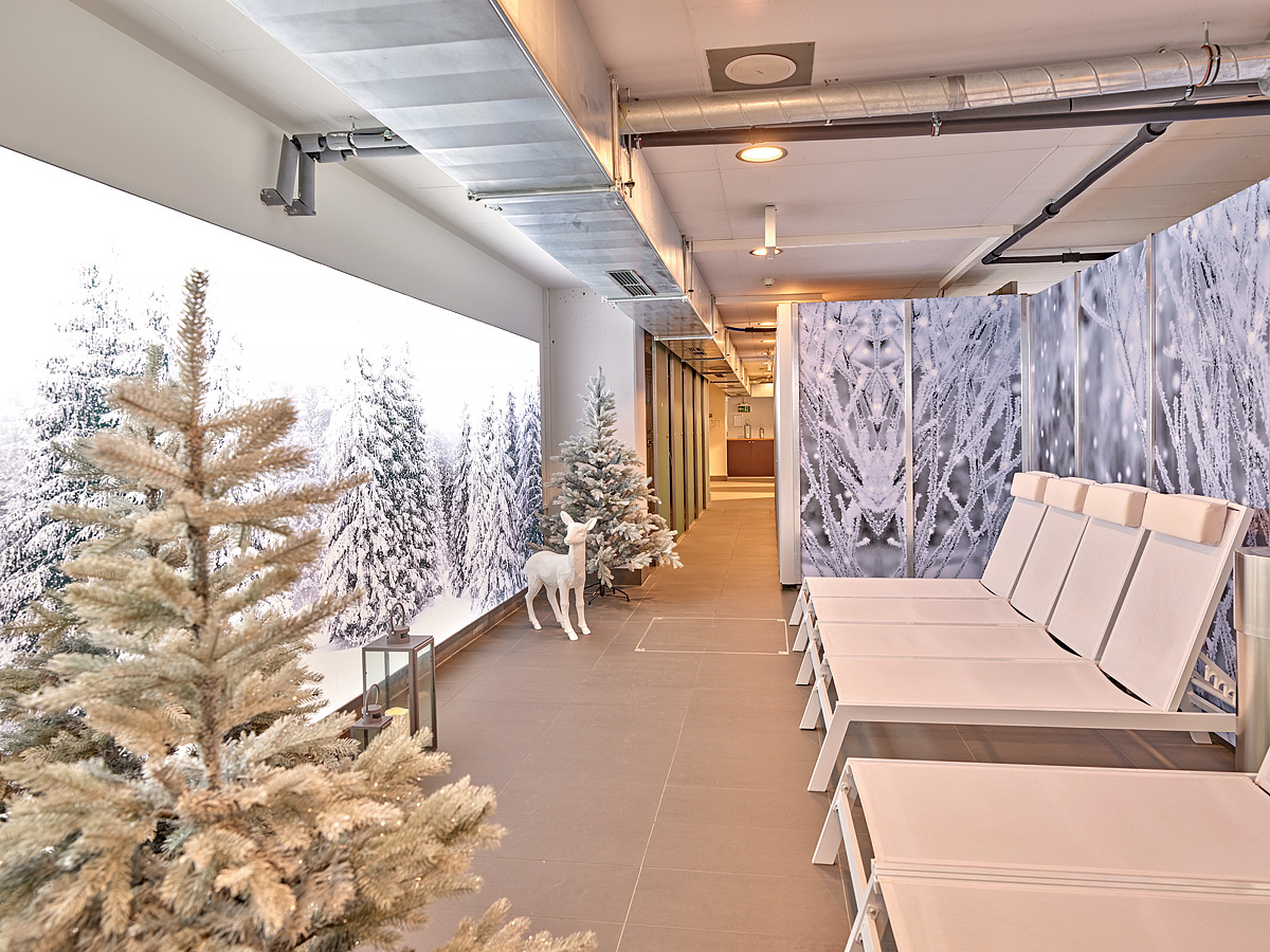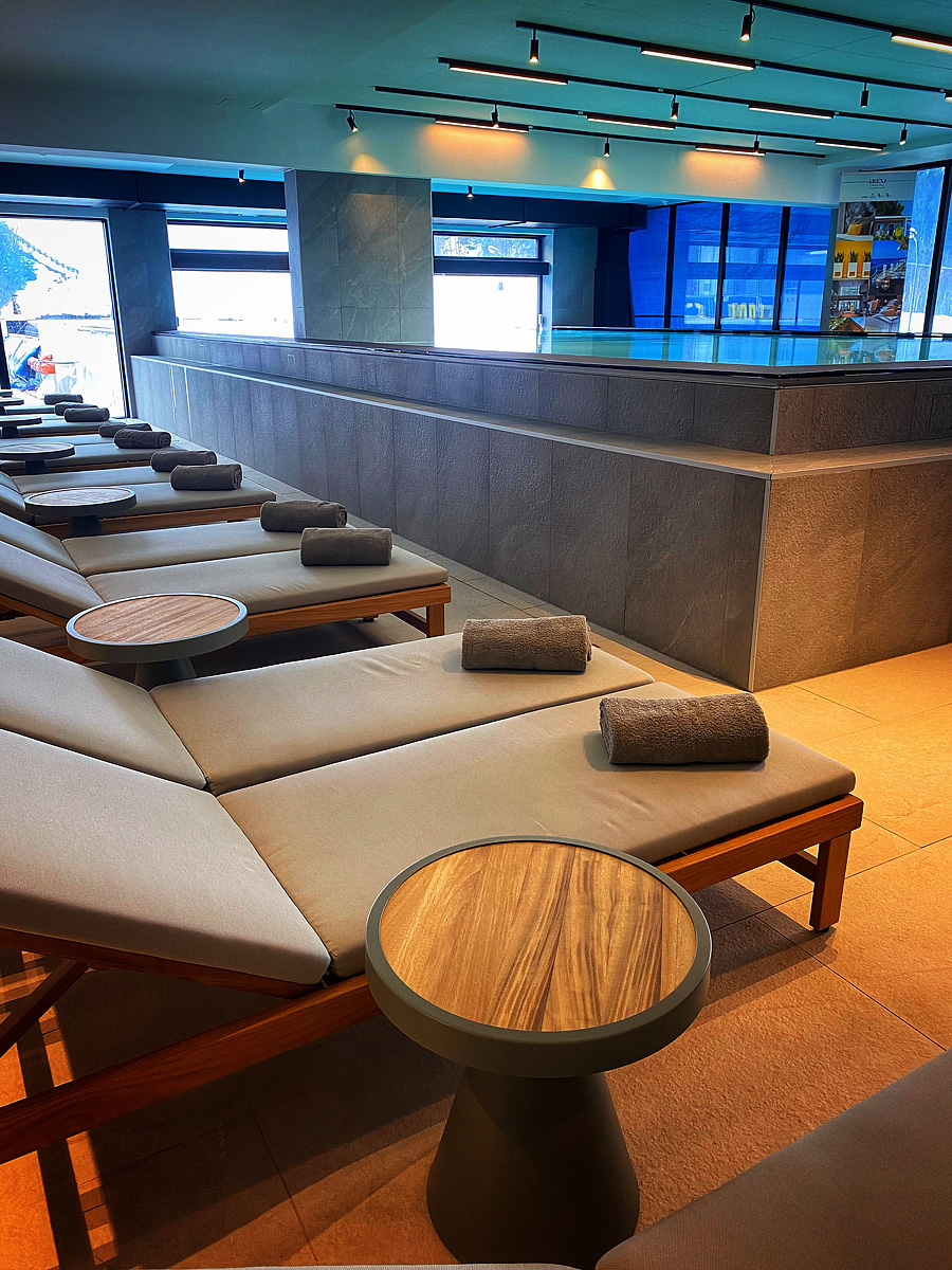 architektonicky zaujímavý hotel pri dolnej stanici lanovky, vonkajší vyhrievaný Infiniti bazén prepojený s vnútorným bazénom a úplne netradične vnútorné rampy a privátny ski depot priamo pred každou izbou