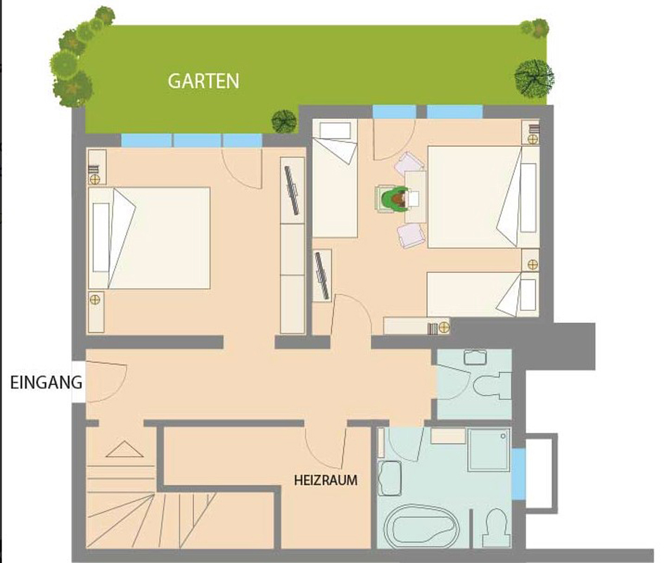 Apartmánový dům 11 - 140 m² - 1. poschodie domu: spálňa s manželskou posteľou, obývacia izba s rozkladacím gaučom pre 2 osoby, samostatná kuchyňa, sociálne zariadenie s vaňou, terasa; 2. poschodie domu: 1 spálňa s manželskou posteľou, spálňa s manželskou posteľou a 2 samostatnými lôžkami, sociálne zariadenie, oddelené WC, balkón