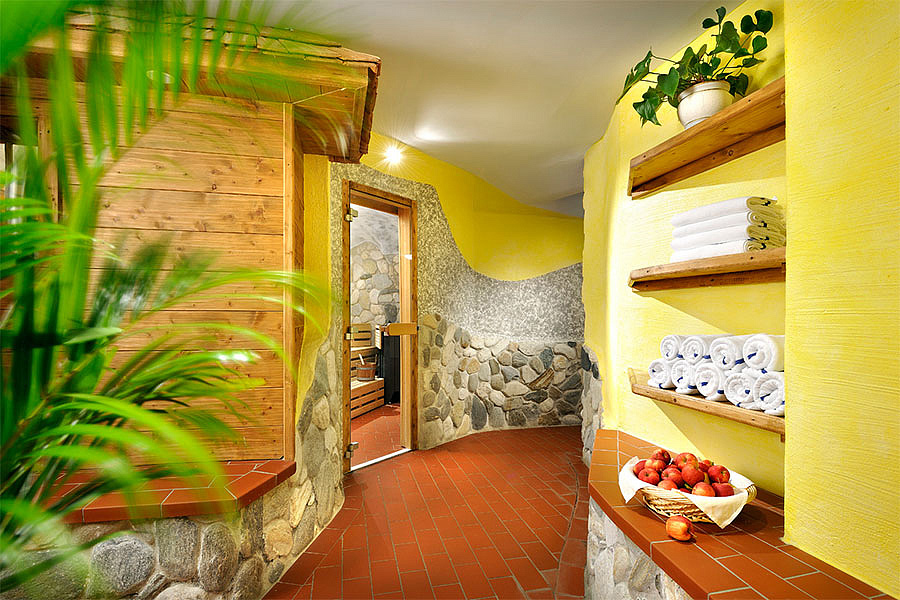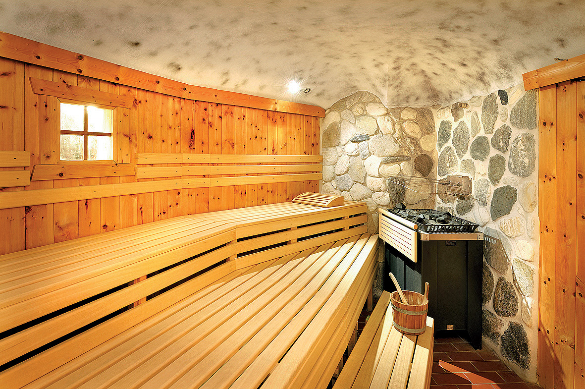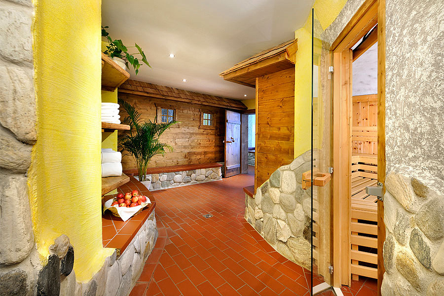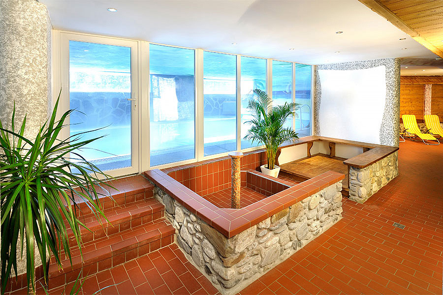 vnútorný a vonkajší bazén 72 m² s umelým vodopádom, vonkajší detský bazénik, fínska sauna, para, infrakabína, horizontálne solárium*, relaxačný kútik s lehátkami, masáže*