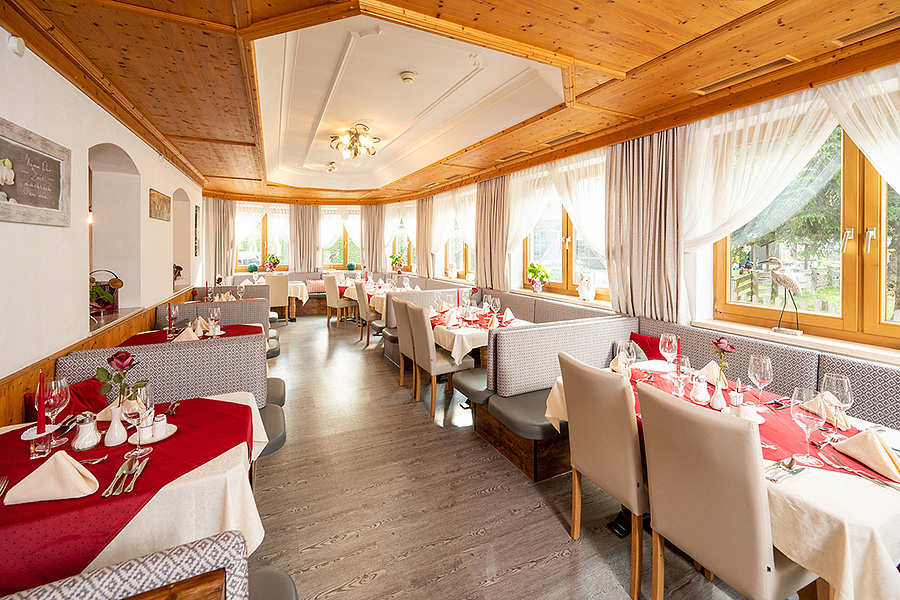večera - servírované menu s výberom z 3 hlavných jedál s prílohou, servírované studené predjedlo, servírovaná polievka, šalátový bufet, servírovaný dezert, nápoje za poplatok; niekoľkokrát týždenne večere formou tématického bufetu