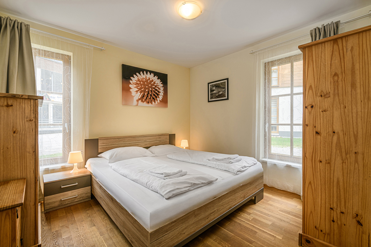 70 m² - 2 spálne s manželskou posteľou so šírkou 140 cm, 1 spálňa s 2 samostatnými lôžkami alebo poschodovou posteľou, obývacia izba s kuchynským kútom, predsieň, sociálne zariadenie so sprchou či vaňou; balkón či terasa; infant nad rámec maximálnej obsadenosti bytu nie je povolený
