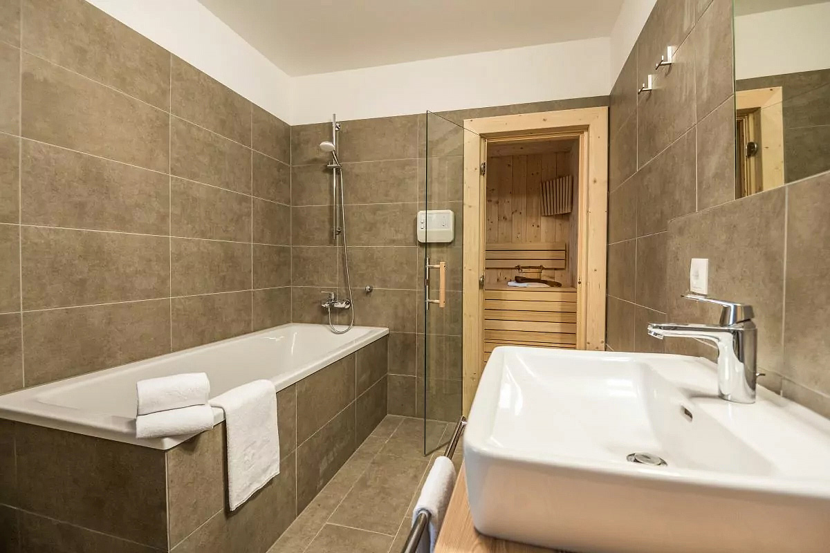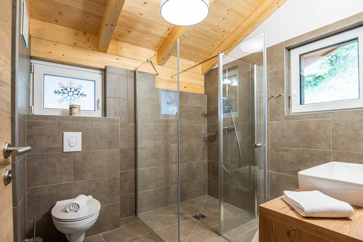 115 m² - prízemie chaletu: 1 spálňa s manželskou posteľou, sociáne zariadenie s vaňou; 1. podlažie chaletu: samostatná kuchyňa, úschovňa lyží a lyžiarskych topánok, samostatné WC, terasa; 2. podlažie chaletu: 3 spálne s manželskou posteľou, 3x sociálne zariadenie (2x so sprchou a 1x so sprchou a privátnou infrasaunou), 2x balkón