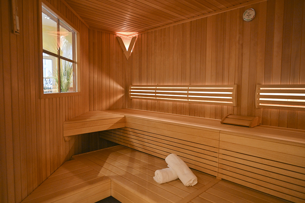 šport a relaxácia - bazén 12 x 6 m, fínska sauna#, bio sauna#, para#, caldarium#, Kneippov chodník#, infrakabína#, relaxačný kútik s ležadlami#, masáže*, posilňovňa, stolný futbal*, služby označené # sú pre deti prístupné až od 14 rokov