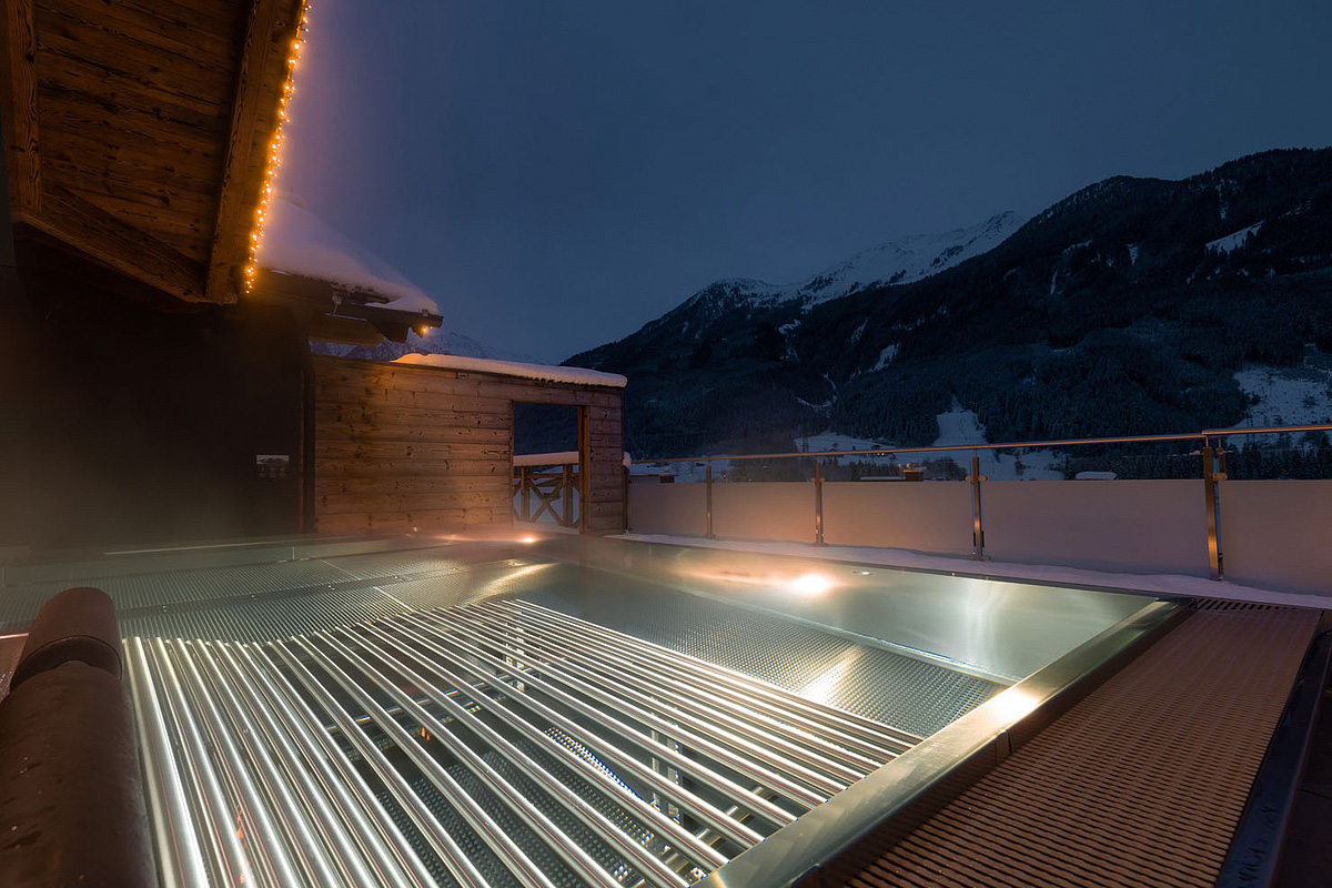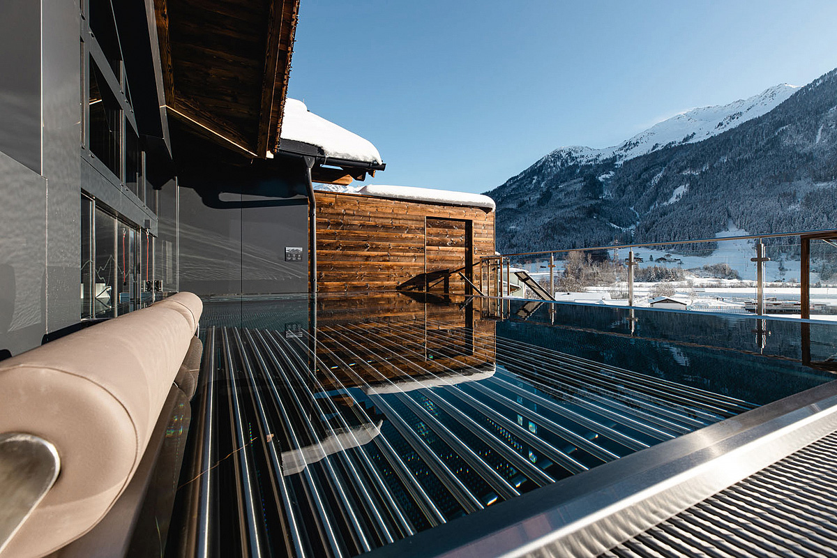 bazén prepojený s vonkajším bazénom umiestneným na streche rezortu, 2x fínska sauna, para, infrakabína, relaxačný kútik s lehátkami, posilňovňa