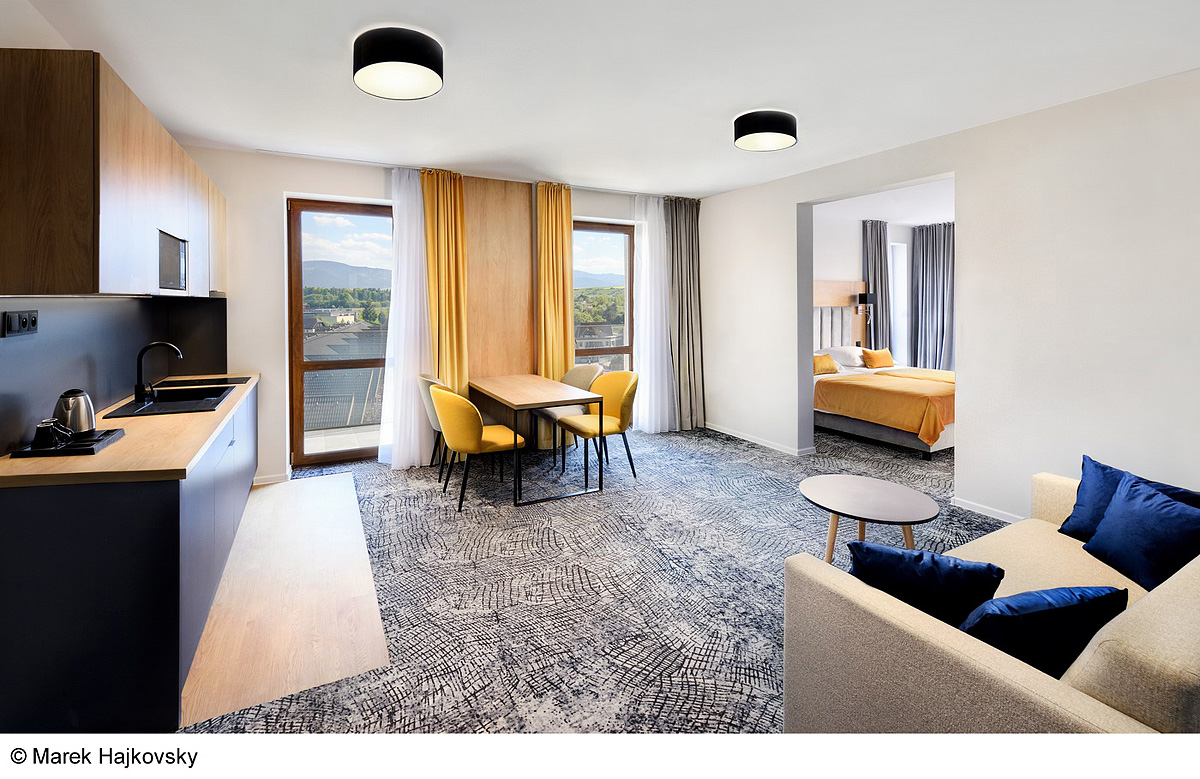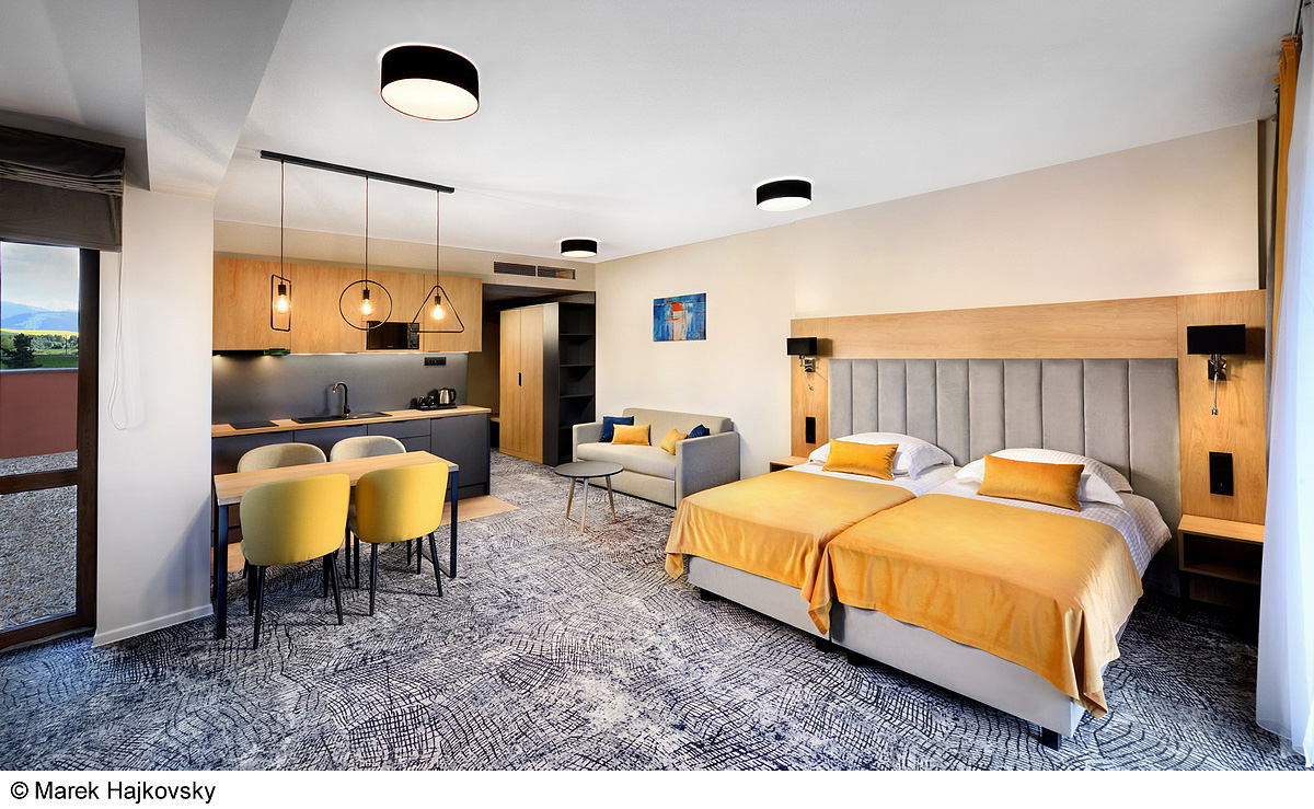apartmán s kuchynským kútom, manželskou posteľou s oddeliteľnými lôžkami a rozkladacím gaučom pre 2 osoby, sociálne zariadenie, spravidla balkón či terasa