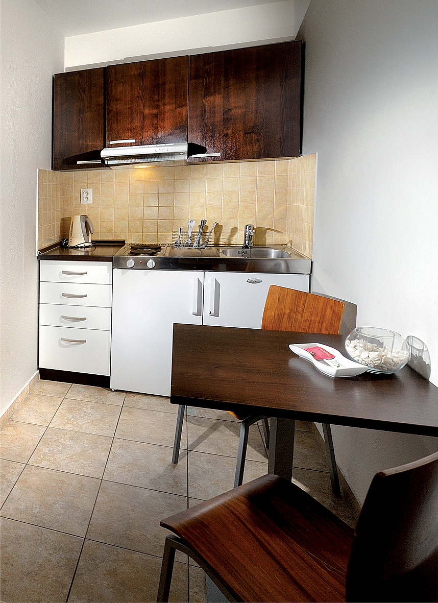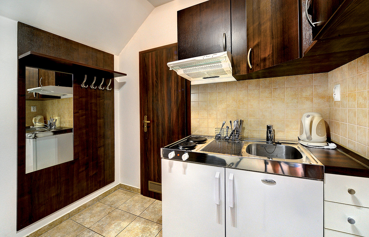 izba s manželskou posteľou a malým kuchynským kútom, sociálne zariadenie; niektoré štúdiá sú situované v podkroví, niektoré s výhľadom na parkovisko; nachádzajú sa v bloku bez výťahu
