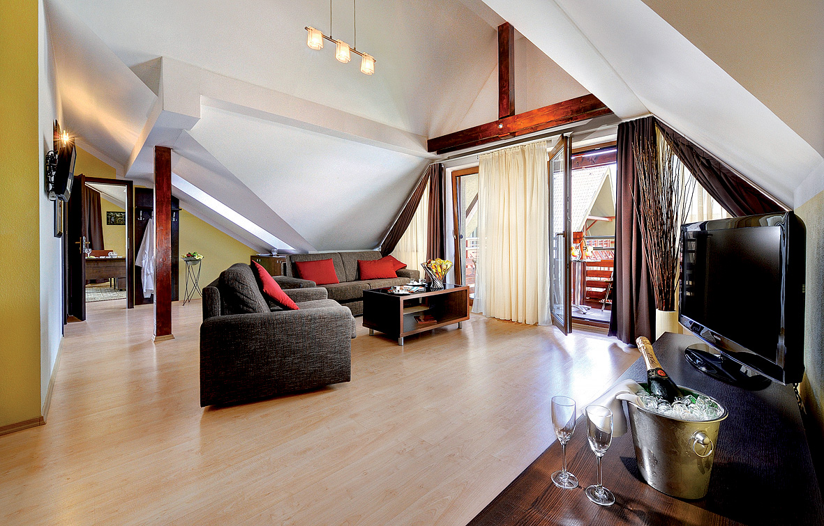 izba s manželskou posteľou s oddeliteľnými lôžkami a rozkladacím kreslom na lôžko pre 1 dieťa do nedovŕšených 12 rokov, sociálne zariadenie; niektoré izby sú situované v podkroví, bez balkóna