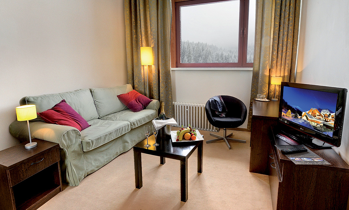 priestrannejšia izba, spálňa s manželskou posteľou či 2 samostatnými lôžkami, obývacia izba s rozkladacím gaučom pre 2 osoby, sociálne zariadenie