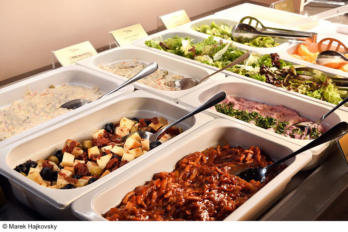 servírované menu s výberom z 3 až 4 hlavných jedál s prílohou, šalátový bufet, servírovaný dezert, nápoje za poplatok