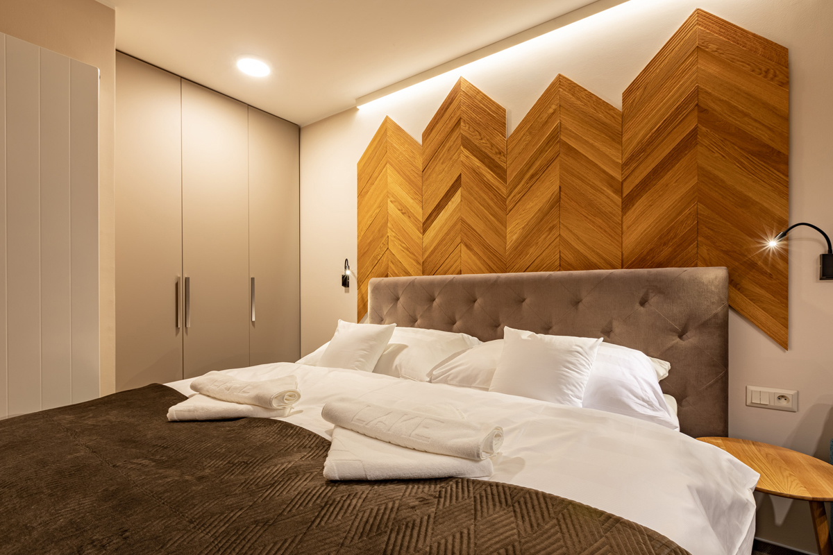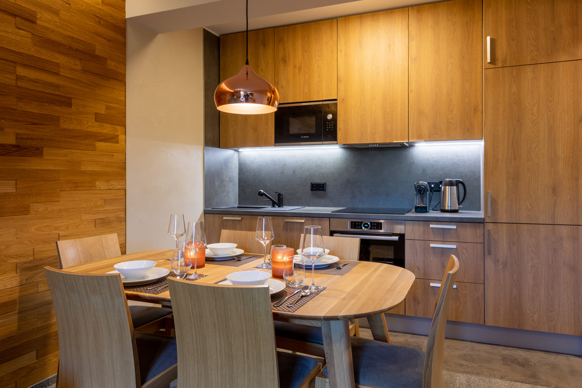 Suite Deluxe 2/3/4 - 52 až 63 m² - spálňa s manželskou posteľou, obývacia izba s rozkladacím gaučom pre 2 osoby, kuchyňa, jedálenský kút, kúpeľňa so sprchou, niektoré apartmány s balkónom