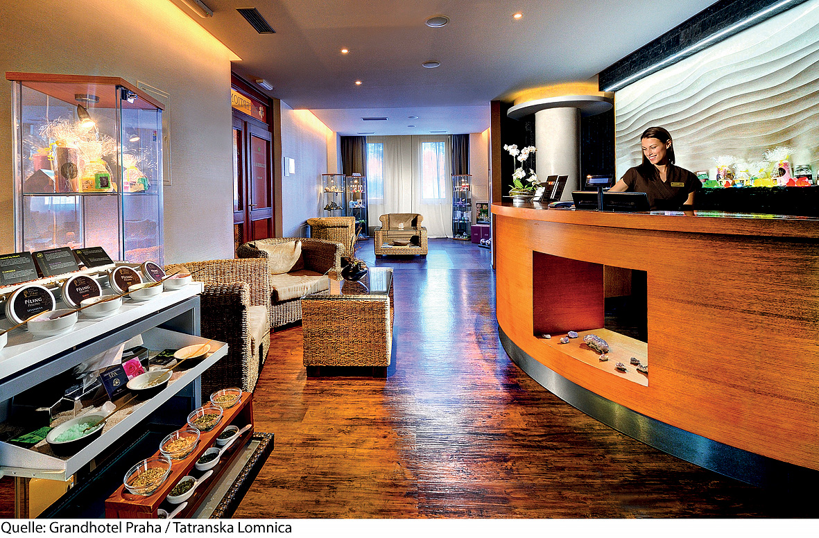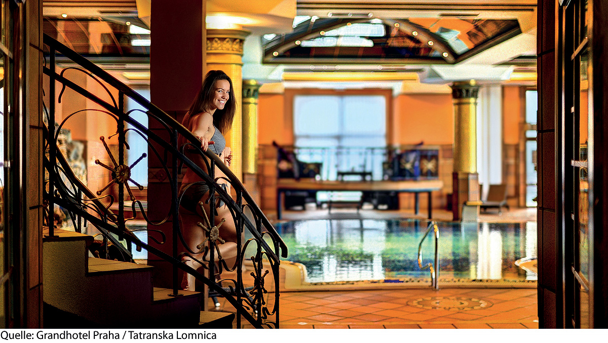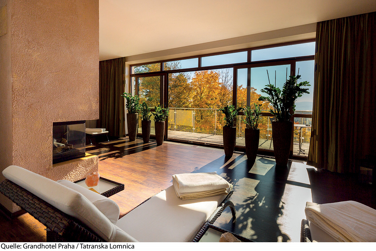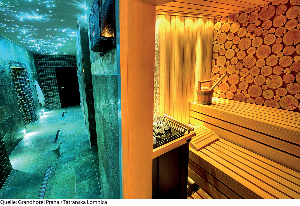 bazén 10 x 5 m s ležadlami, vonkajší vyhrievaný bazén 9 x 4 m s ležadlami, vonkajšia vírivka až pre 8 osôb, fínská sauna, vonkajšia fínska sauna, para, termárium, infrakabína, hydromasážna sprcha, masáže*, kúpeľné kúry*, posilovací kútik