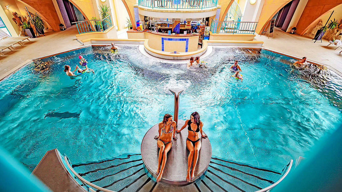 aquapark - (relaxačná časť: 3x vonkajší termálny bazén s vodnými atrakciami a tobogánmi, 2x vnútorný termálny bazén, fínska a parná sauna, vodný bar, 50 m plavecký bazén); wellness centrum - 8x sauna (fínska, soľná, mentolová, suchá, infra), relaxačný bazén so zátokou lásky, vírivky, relaxačné miestnosti s biokrbmi, snežné jaskyne; fitness centrum, kryokomora*, klinika krásy*