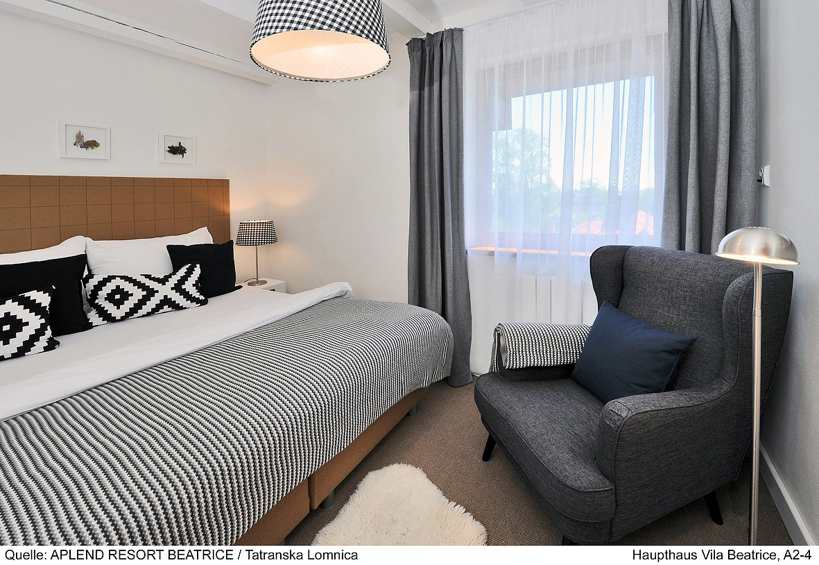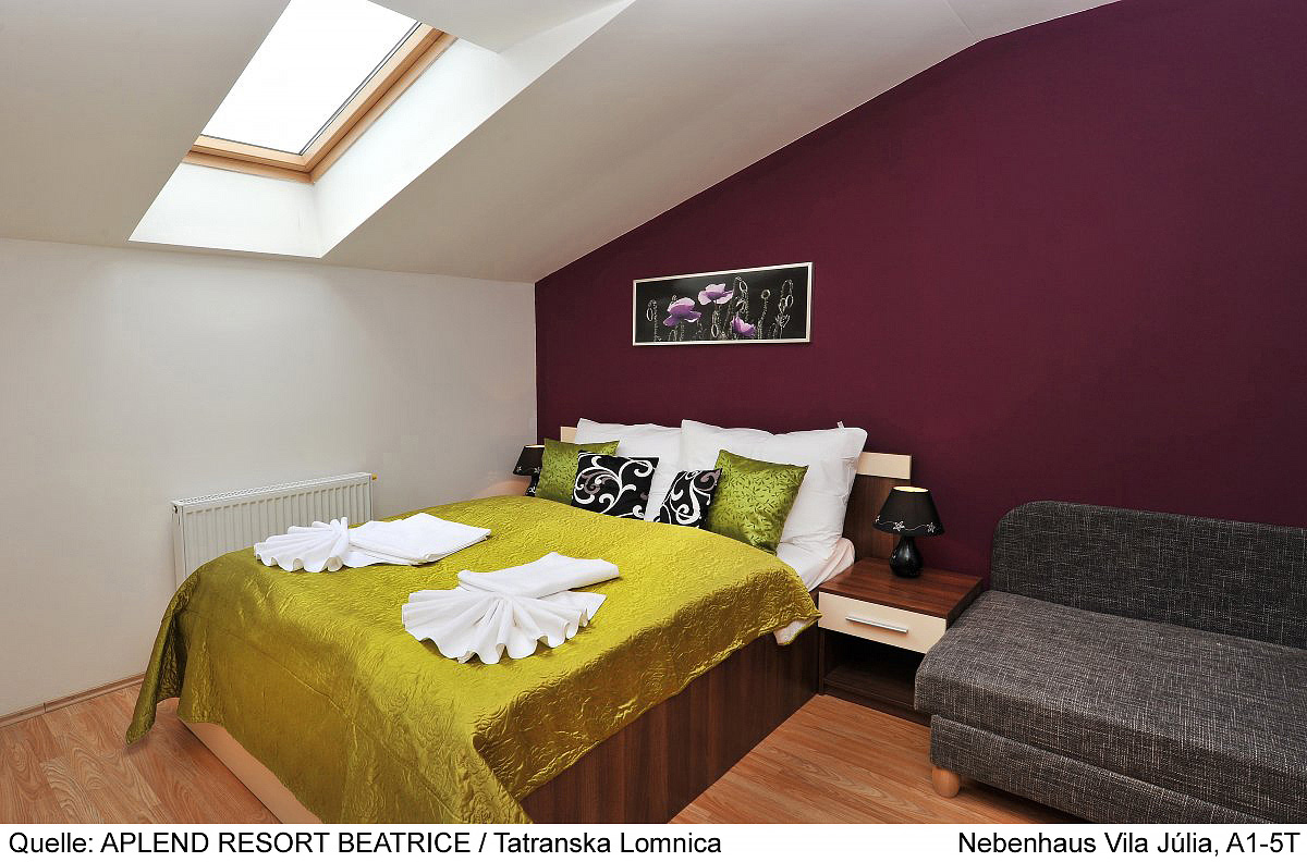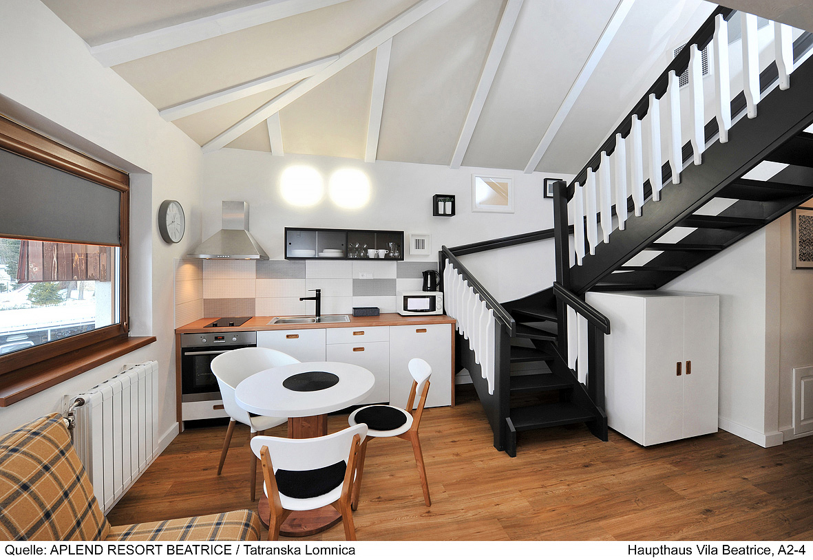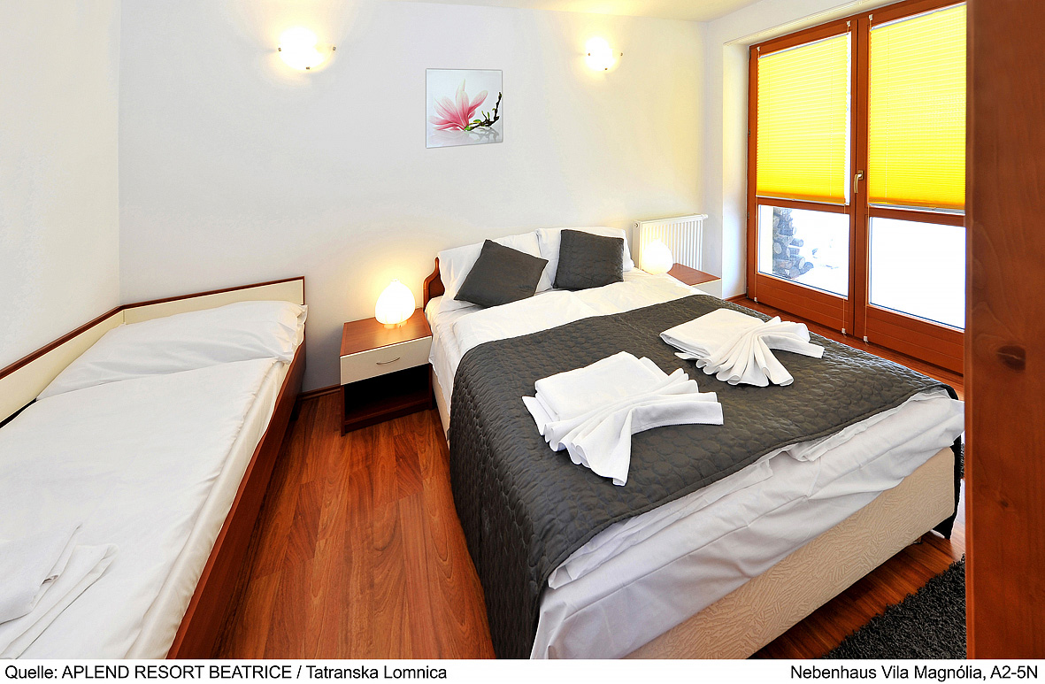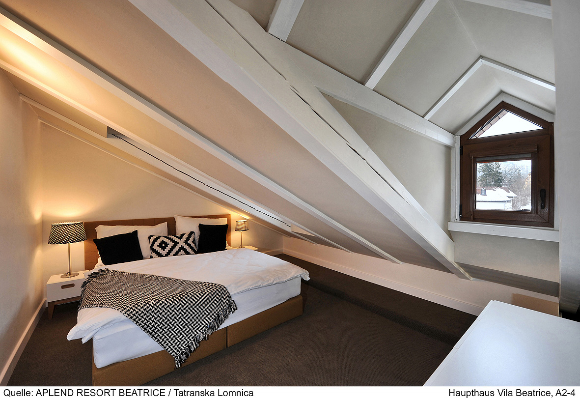 100 m² dvojpodlažný apartmán: 1. podlažie: spálňa s 2 oddeliteľnými lôžkami, obývacia izba s gaučom a kuchynským kútom s el. rúrou, sociálne zariadenie so sprchou; 2. podlažie 3 spálne s manželskou posteľou, sociálne zariadenie so sprchou či vaňou, fínska sauna, panoramatický balkón
