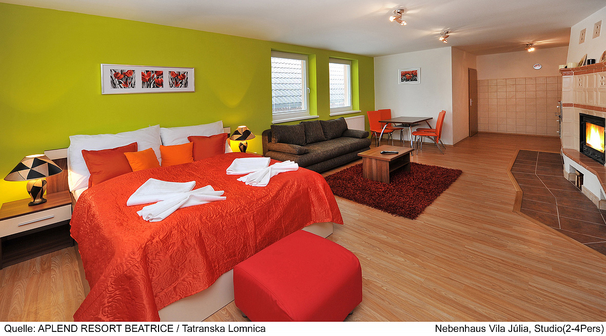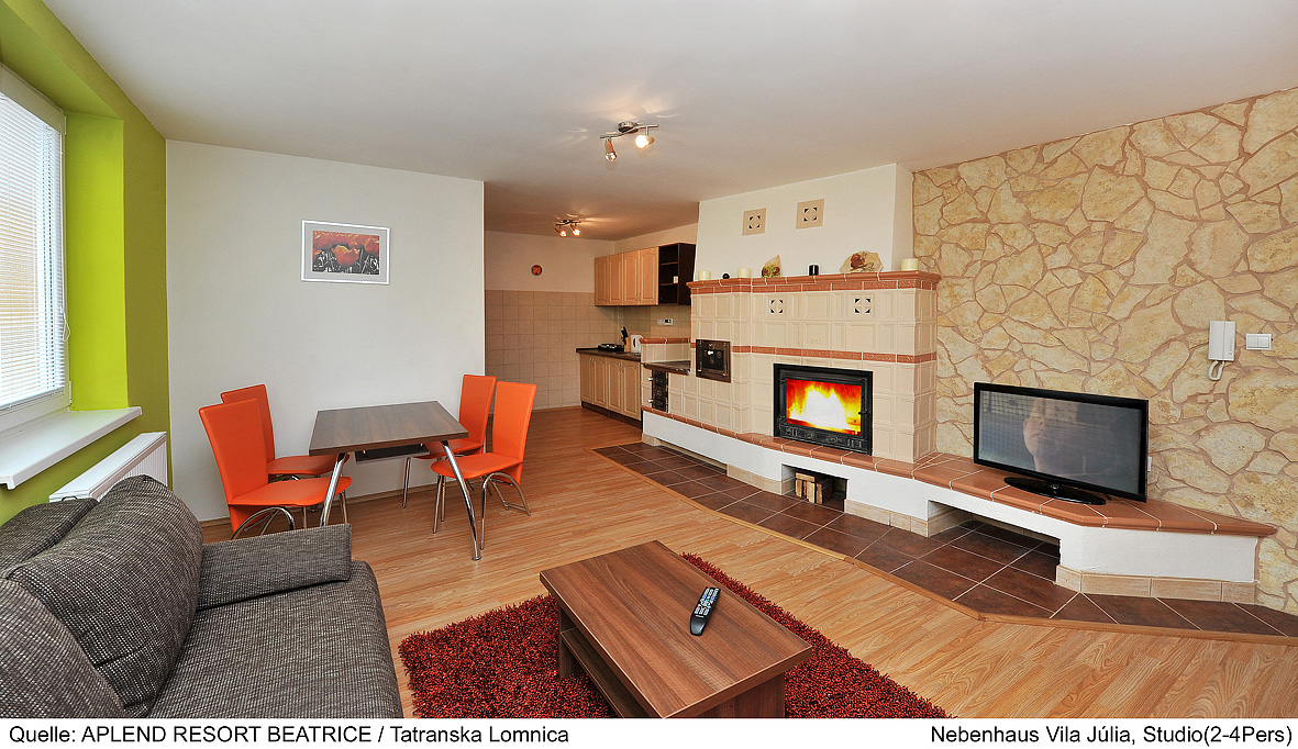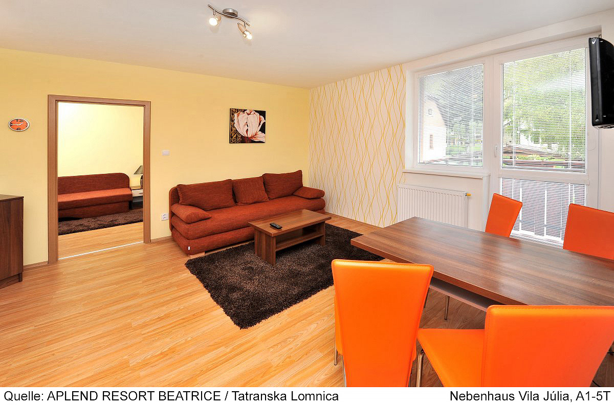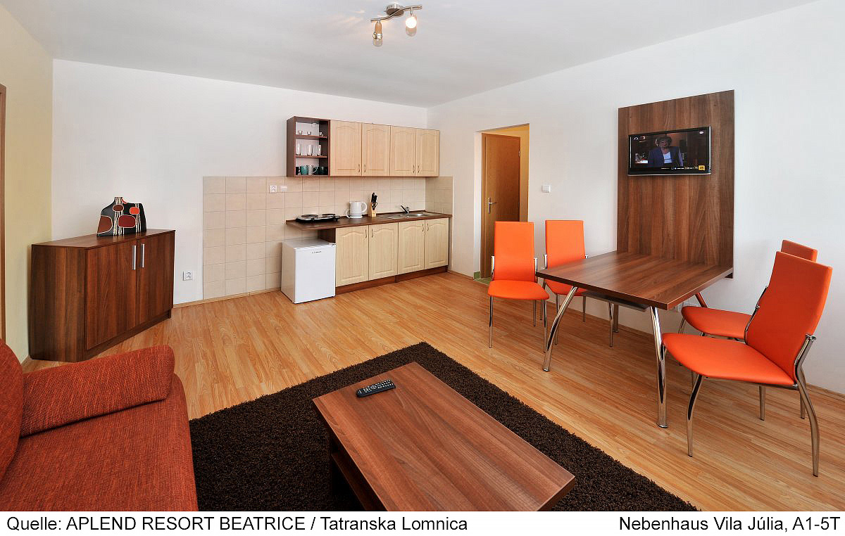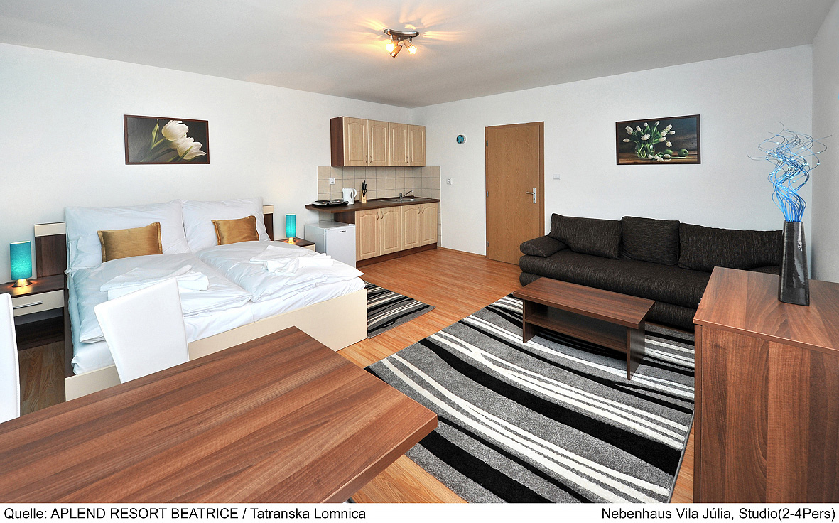 25 m² - obývacia izba s manželskou posteľou a rozkladacím gaučom pre 2 osoby, kuchyňa, jedálny kút, sociálne zariadenie so sprchou; všetky apartmány sa nachádzajú v prízemí