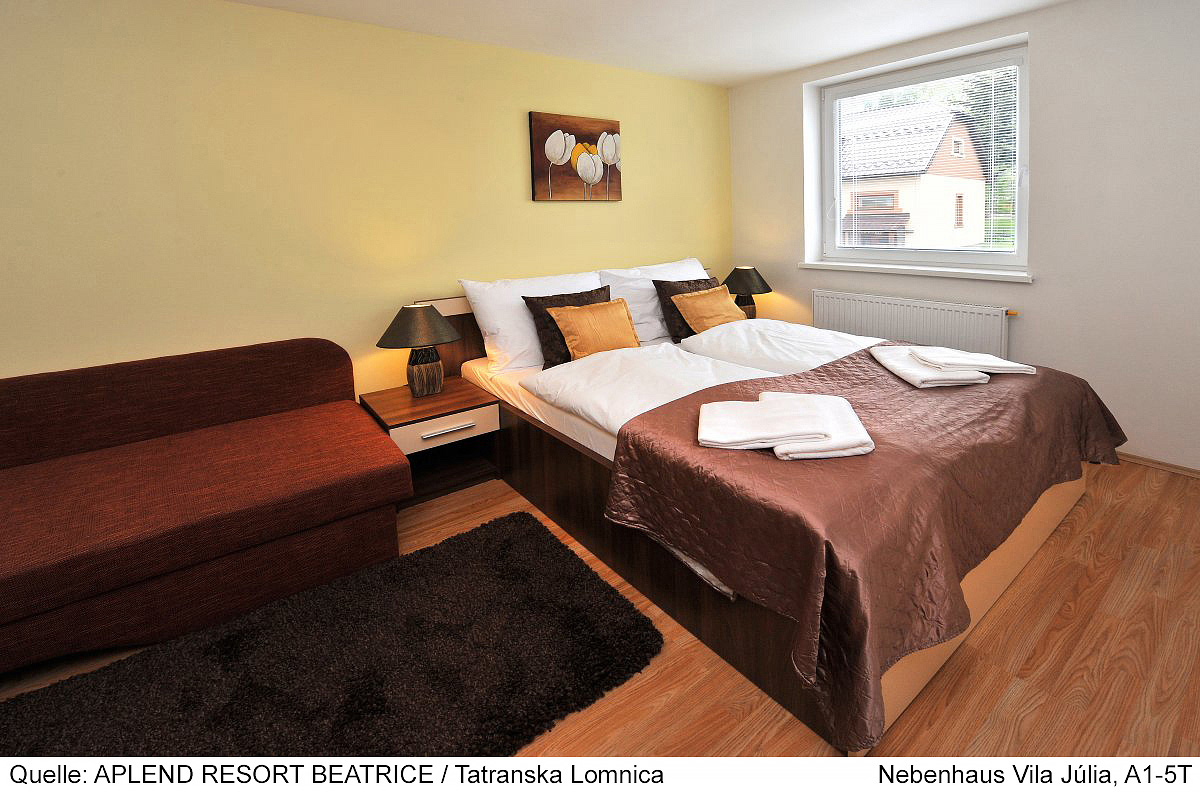 45 m² spálňa s manželskou posteľou, spálňa s 2 oddeliteľnými lôžkami, obývacia izba s kuchynským kútom a rozkladacím gaučom pre 2 osoby, sociálne zariadenie spravidla so sprchou, balkón