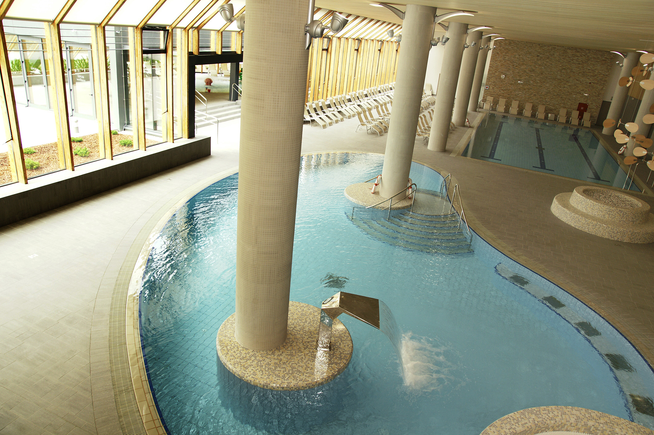 vodný svet (250 m²): relaxačný bazén s vodopádom a masážnymi lavicami (32°C), bazén s protiprúdom (28°C), vírivka (35°C), detský bazén s herným vybavením (32°C), terasa v letnom období