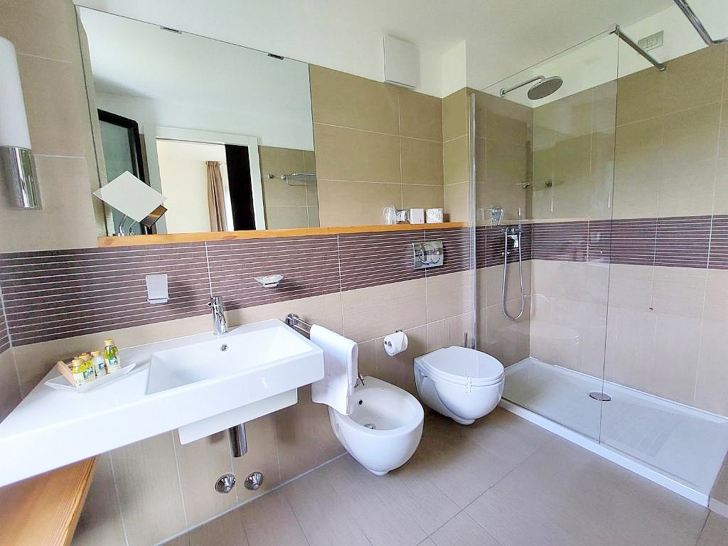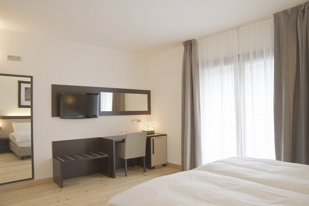 izba s manželskou posteľou alebo 2 samostatnými lôžkami a prípadne 1 či 2 ďalšími samostatnými lôžkami, sociálne zariadenie so sprchou alebo vaňou, spravidla balkón alebo terasa