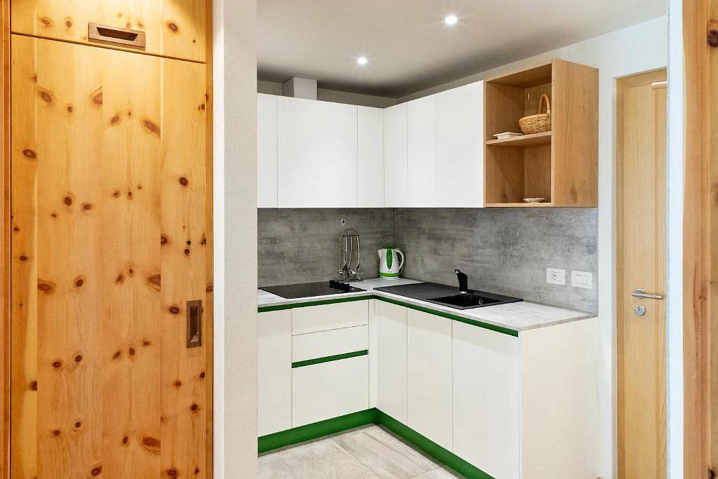 38 m² – 1 spálňa s manželskou posteľou, obývacia izba s kuchynským kútom a rozkladacím gaučom pre 1 osobu, sociálne zariadenie, balkón; maximálna obsaditeľnosť apartmánu sú 2 dospelé osoby a 1 dieťa do nedovŕšených 14 rokov