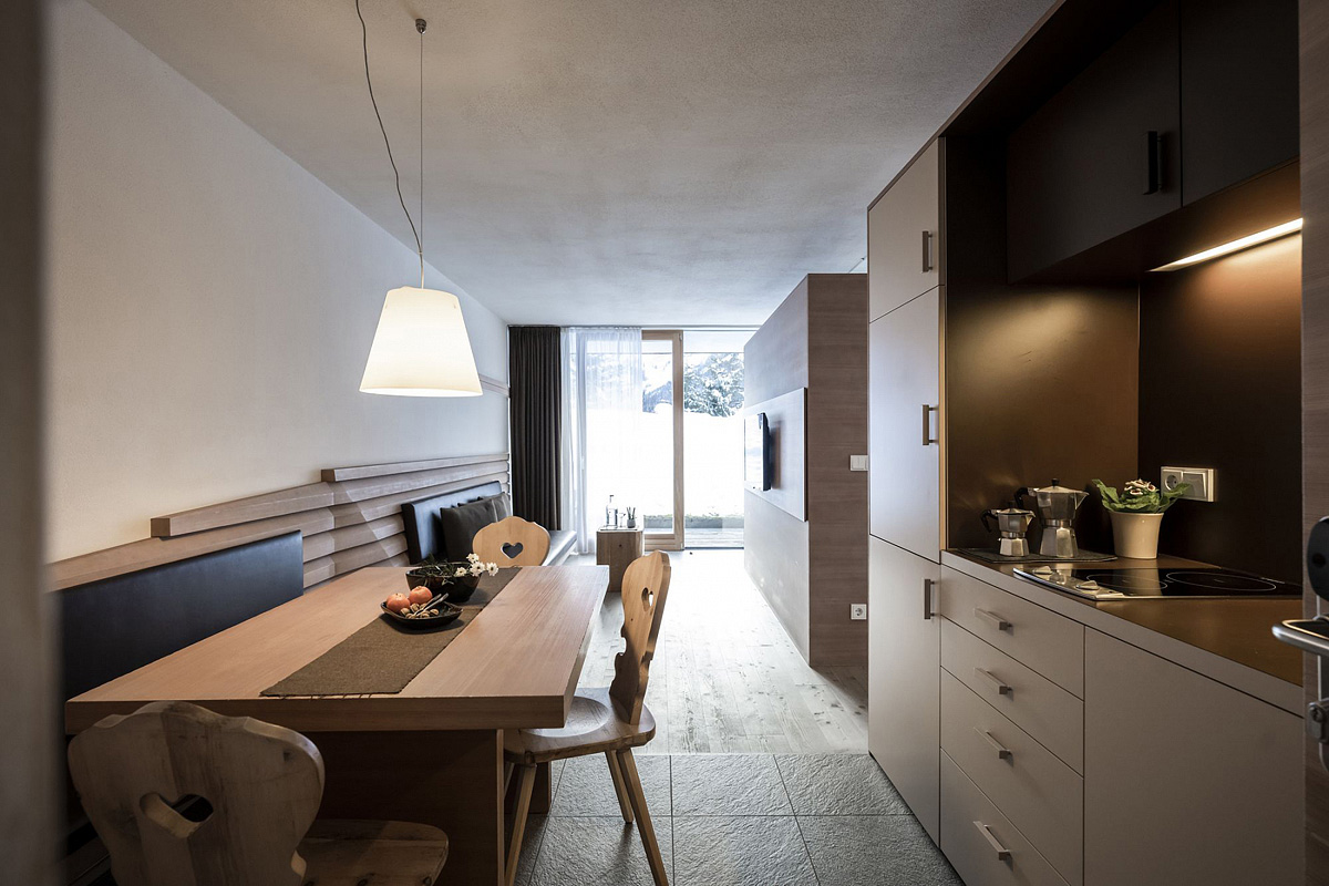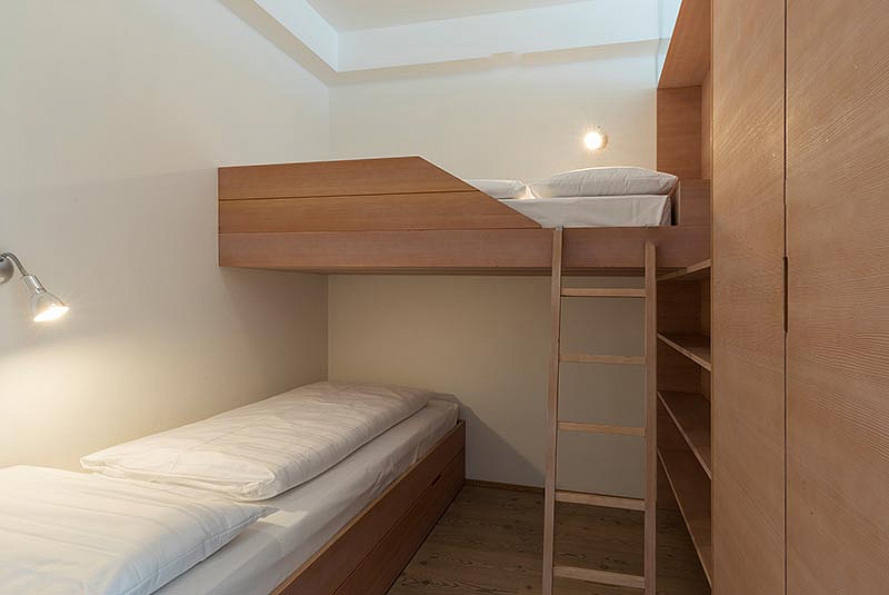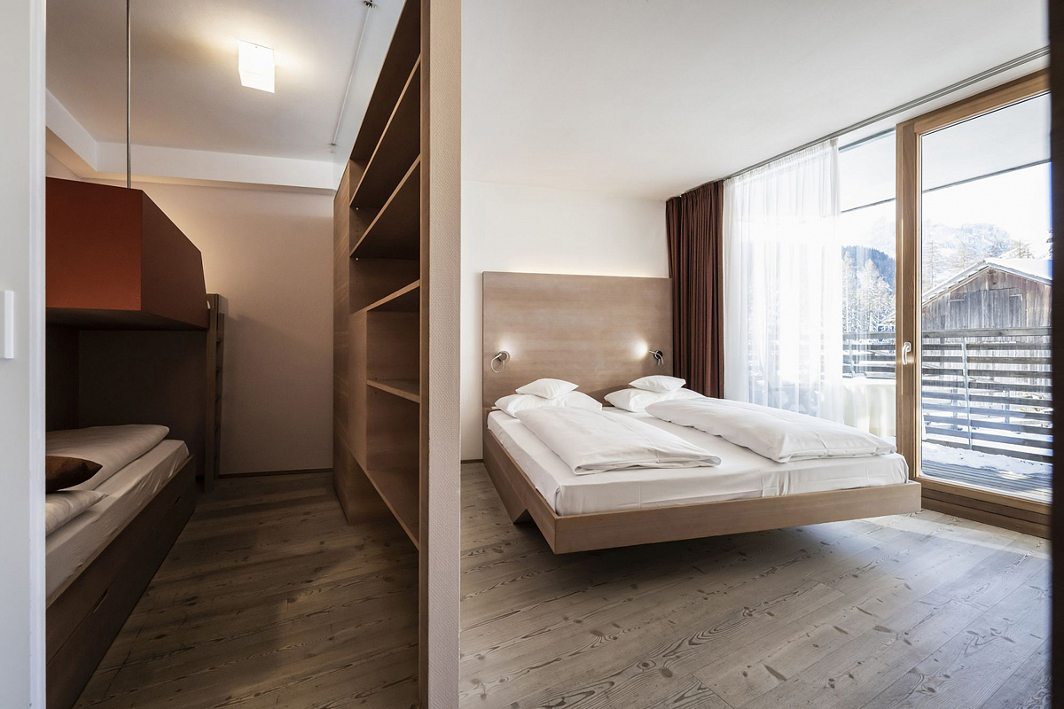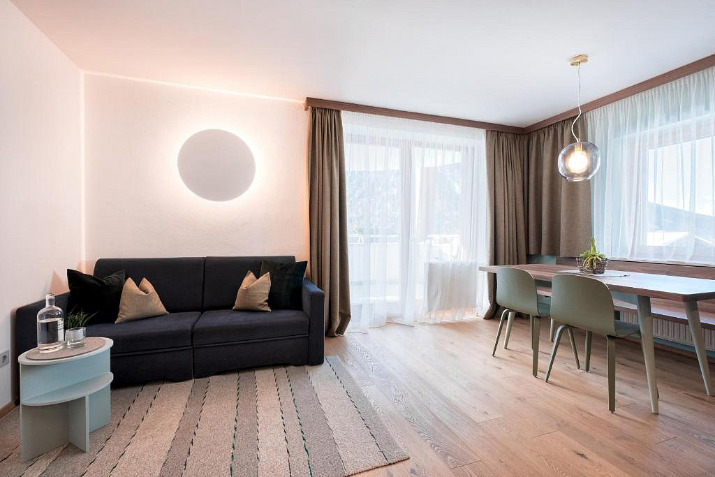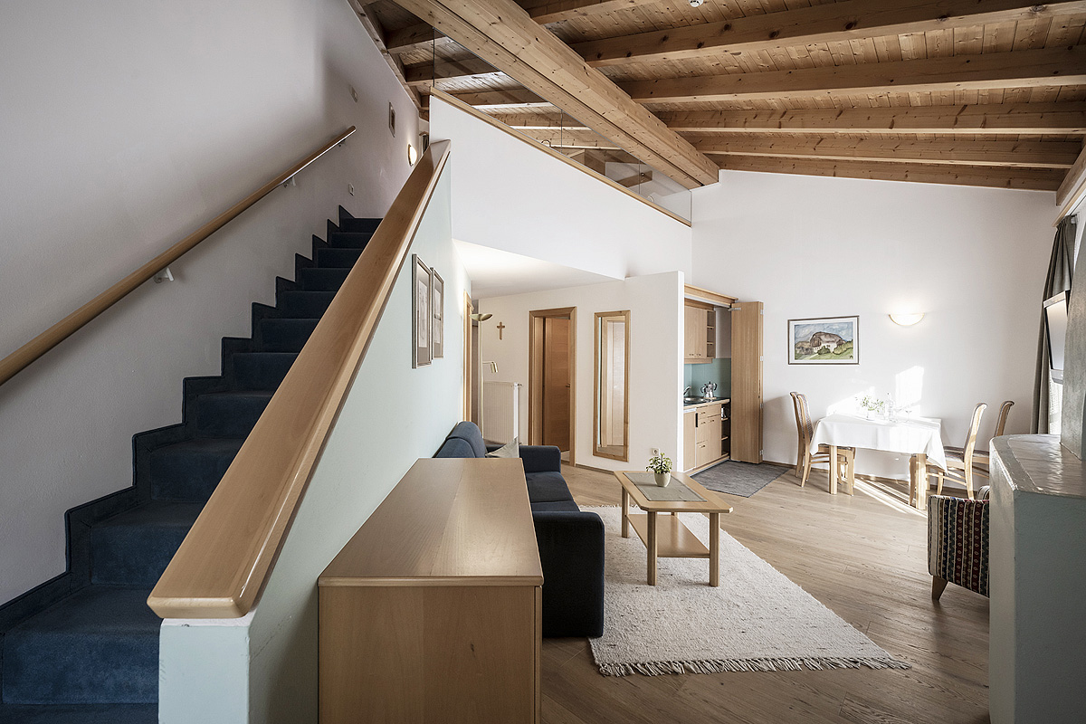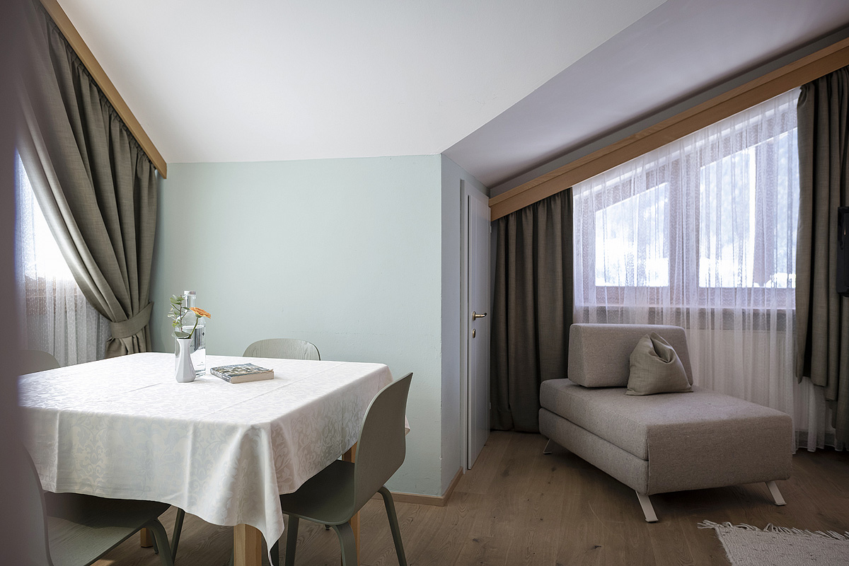 55 m² - 1 spálňa s manželskou posteľou a čiastočne oddelenou poschodovou posteľou, obývacia izba s kuchynským kútom, sociálne zariadenie so sprchou či vaňou, balkón či terasa so vstupom na záhradu; maximálna obsaditeľnosť apartmánu sú 2 dospelé osoby a 2 deti do nedovŕšených 18 rokov