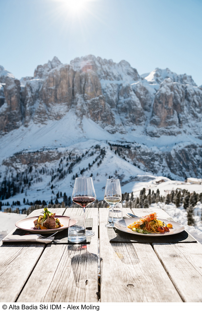 Alta Badia, to sú však už tradične i niektoré zaujímavé gastronomické iniciatívy. Napríklad akcia nazvaná „A Taste for skiing“ – zažijete pri nej gourmétske ochutnávky na horských chatách ocenených michelinskými hviezdami. Sezónu otevírá „Gourmet Skisafari“. Pod názvom „Sommelier on the slopes“ sa 6x počas zimy skrývajú ochutnávky vín na horských chatách. „Breakfast with powder snow“ je unikátny zážitok v Las Vegas Lodge v San Cassiane – po transfére snežnými skútrami následujú raňajky v horách počas rozodnenia. „Wine Skisafari“ znamená ochutnávku najlepších juhotirolských vín na 4 horských chatách na záver sezóny, konkrétne 24. marca 2024.
