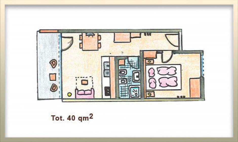40 m² - 1 spálňa s manželskou posteľou, obývacia izba s kuchynským kútom a rozkladacím gaučom pre 2 osoby, sociálne zariadenie, balkón