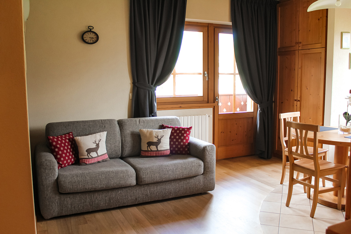 42 m² - 1 spálňa s manželskou posteľou, obývacia izba s kuchynským kútom a rozkladacím gaučom pre 2 osoby, sociálne zariadenie so sprchou, balkón; jeden apartmán je menší a má kuchyňu vo vyvýšenom podlaží prístupnú po schodoch