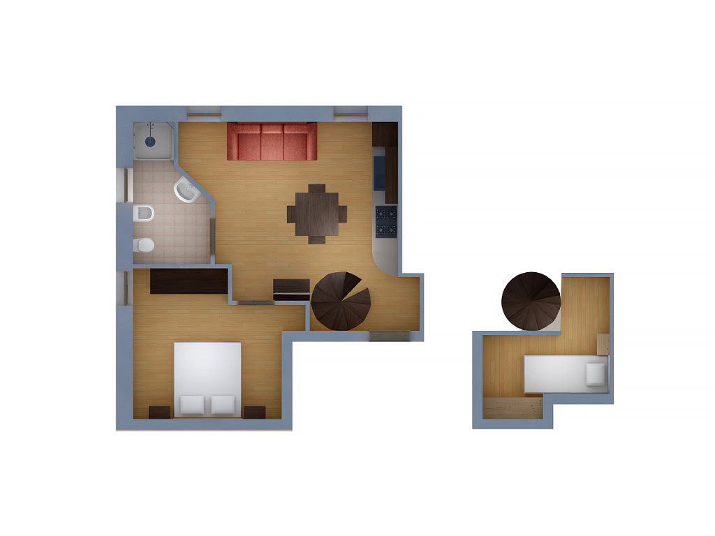 45 m² - 1. podlažie apartmánu: 1 spálňa s manželskou posteľou, obývacia izba s kuchynským kútom, sociálne zariadenia; 2. podlažie apartmánu – neuzavreté poschodie s 1 samostatným lôžkom