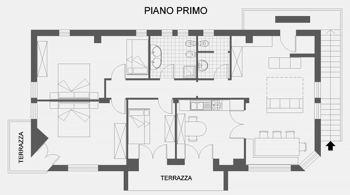 85 m² - 1 spálňa s manželskou posteľou, 1 spálňa s manželskou posteľou a poschodovou posteľou, 1 spálňa s poschodovou posteľou, obývacia izba s kuchynským kútom a 2x gauč pre 1 osobu, sociálne zariadenie so sprchou, samostatné WC, 2x balkón