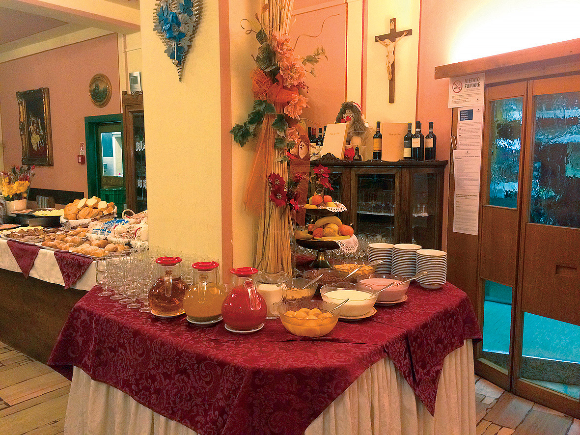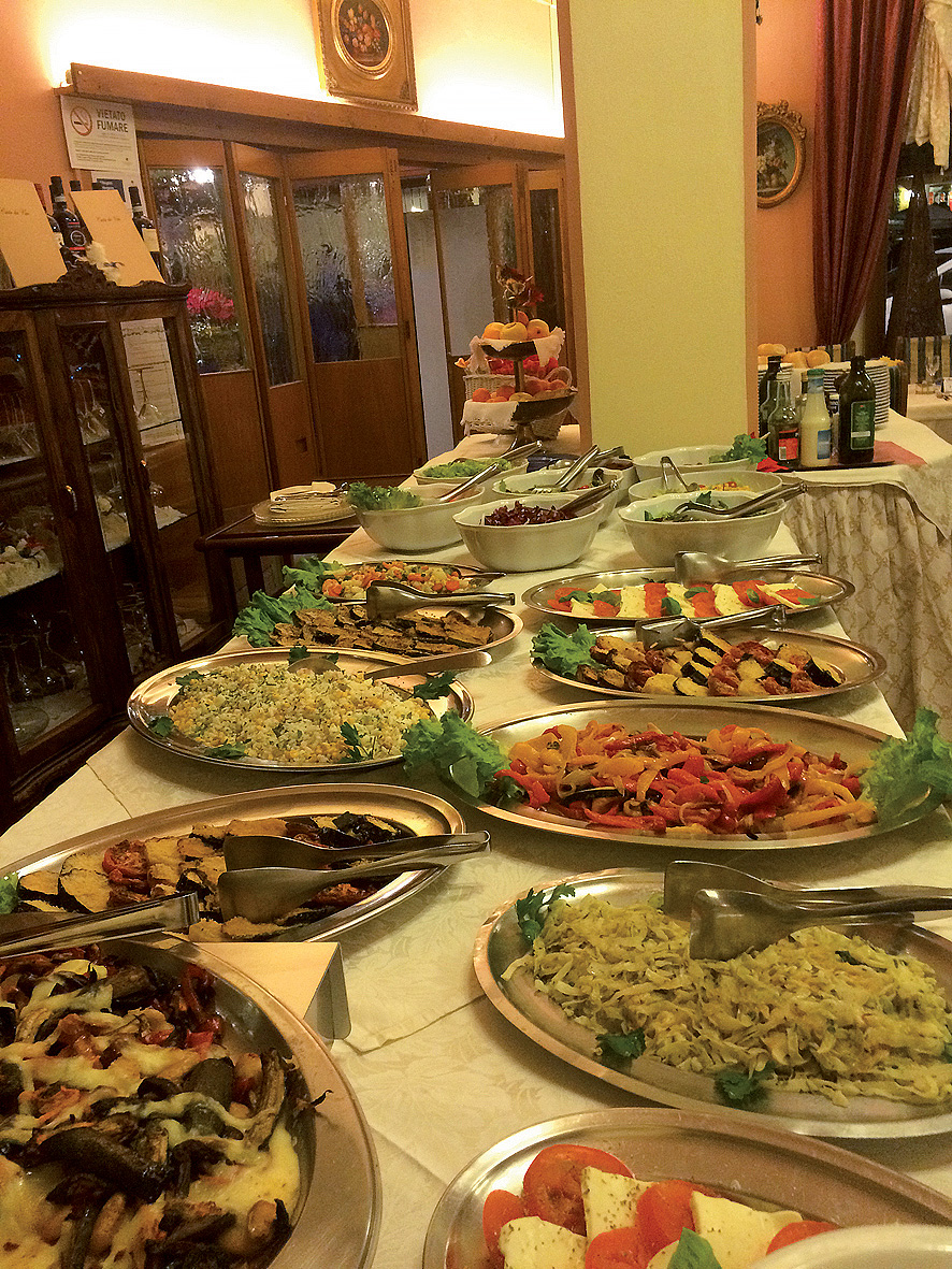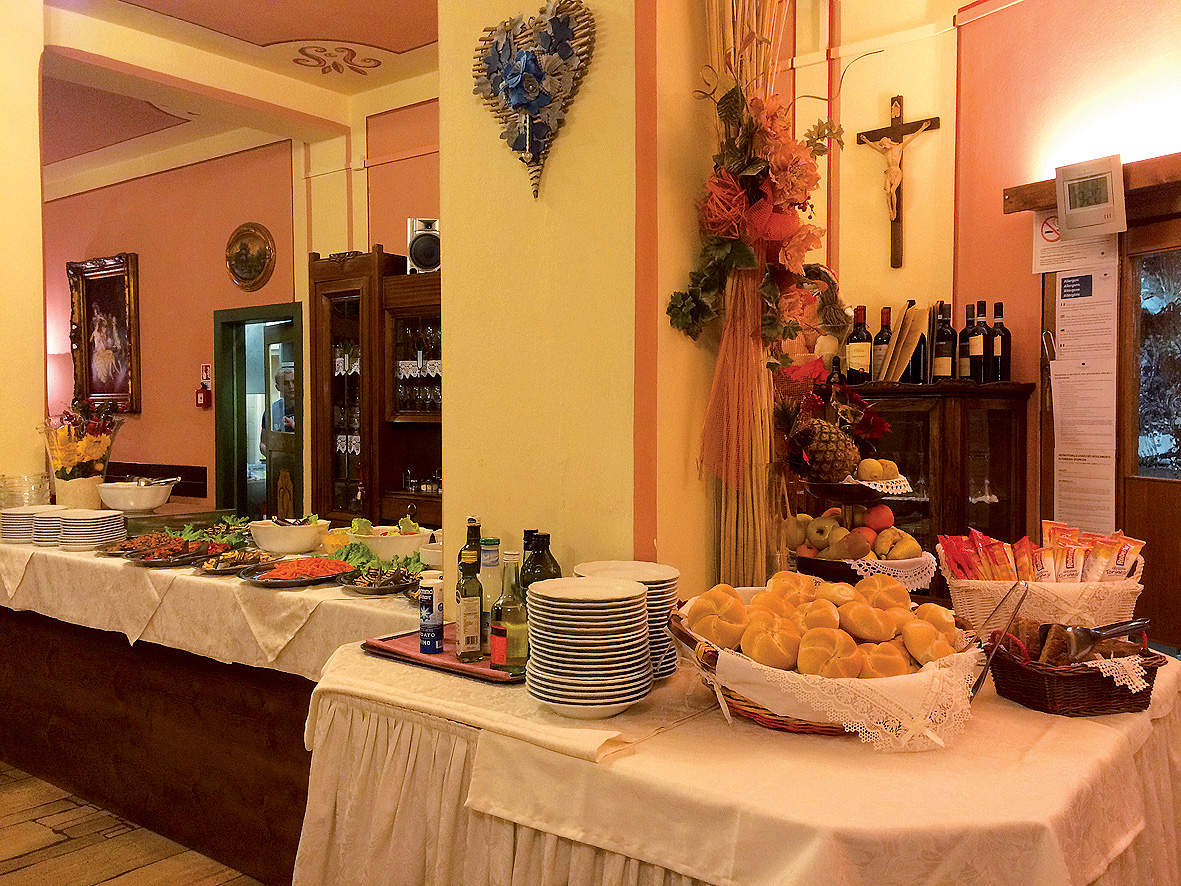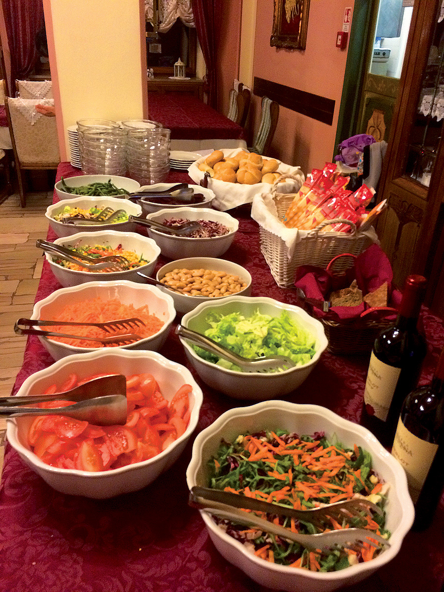 servírované menu s výberom z 2 až 3 studených a teplých predjedál a 3 hlavných jedál s prílohou, šalátový bufet, nápoje za poplatok