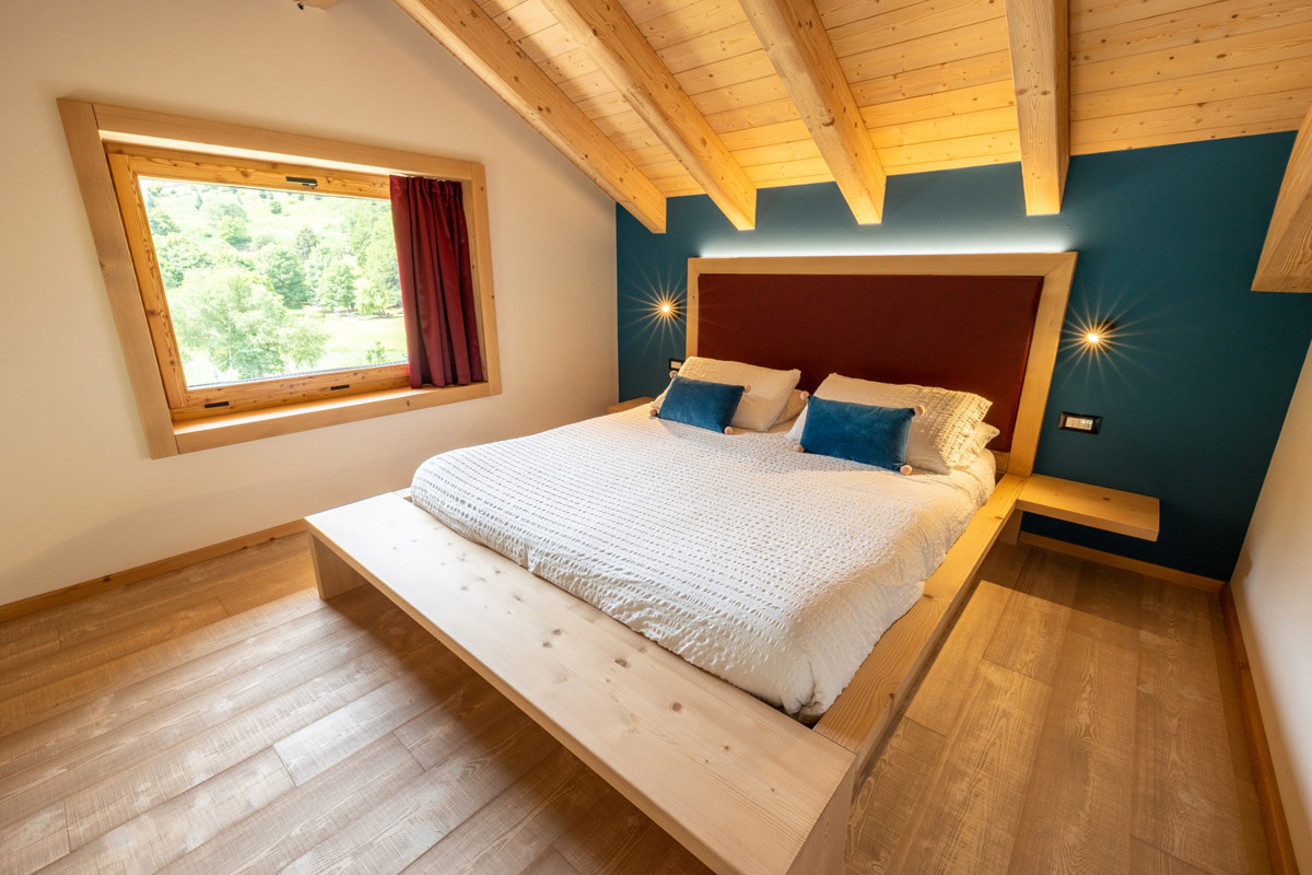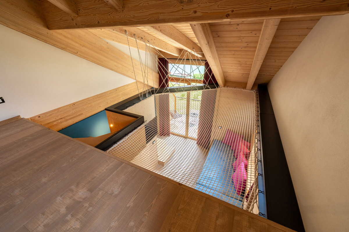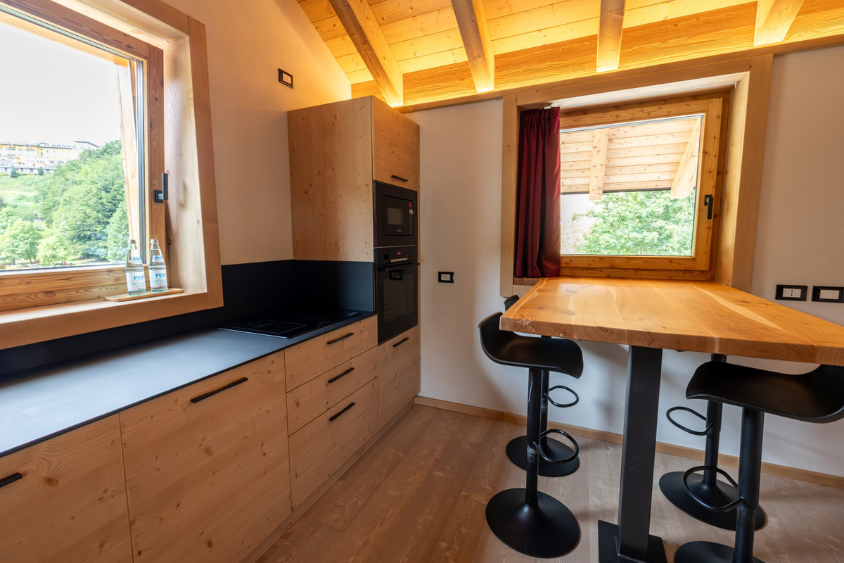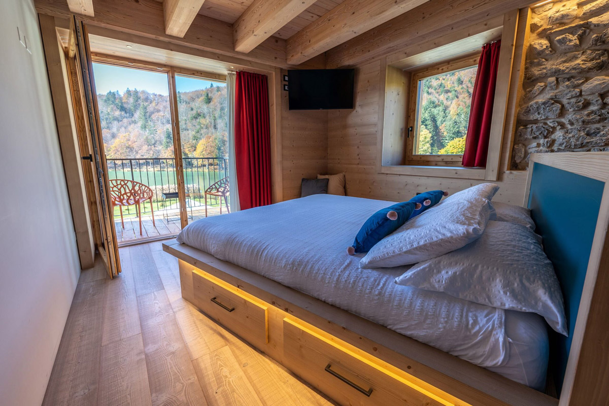 55 m² - spálňa s manželskou posteľou na otvorenom mezonete, obývacia izba s 2 samostatnými lôžkami a prípadne prístelkou pre 1 osobu, obytná kuchyňa so sedením, sociálne zariadenie, terasa s výhľadom na jazero