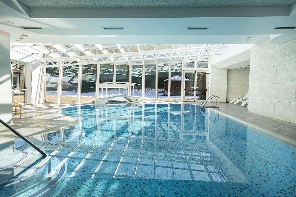 bazén 15 x 6 m s lehátkami, sauna#*, para#*, 2x multifunkčná sprcha#* horizontálne a vertikálne solárium#*, relaxačný kútik#* s lehátkami, masáže*, kozmetické služby*, veľká posilňovňa; služby označené # môžu využívať len deti od 16 rokov; deti môžu využívať bazén len vo vyhradených časoch