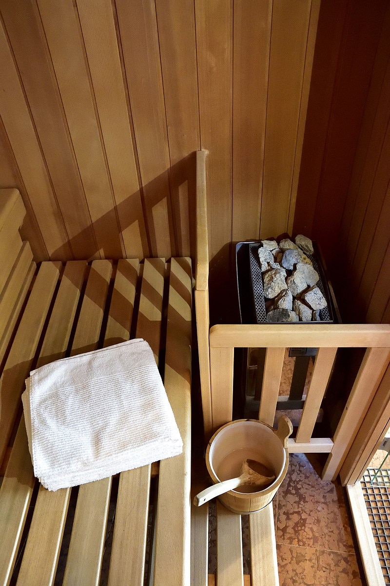 bazén nepravidelného tvaru s lehátkami, sauna, 2x hydromasážna vaňa*, solárium*