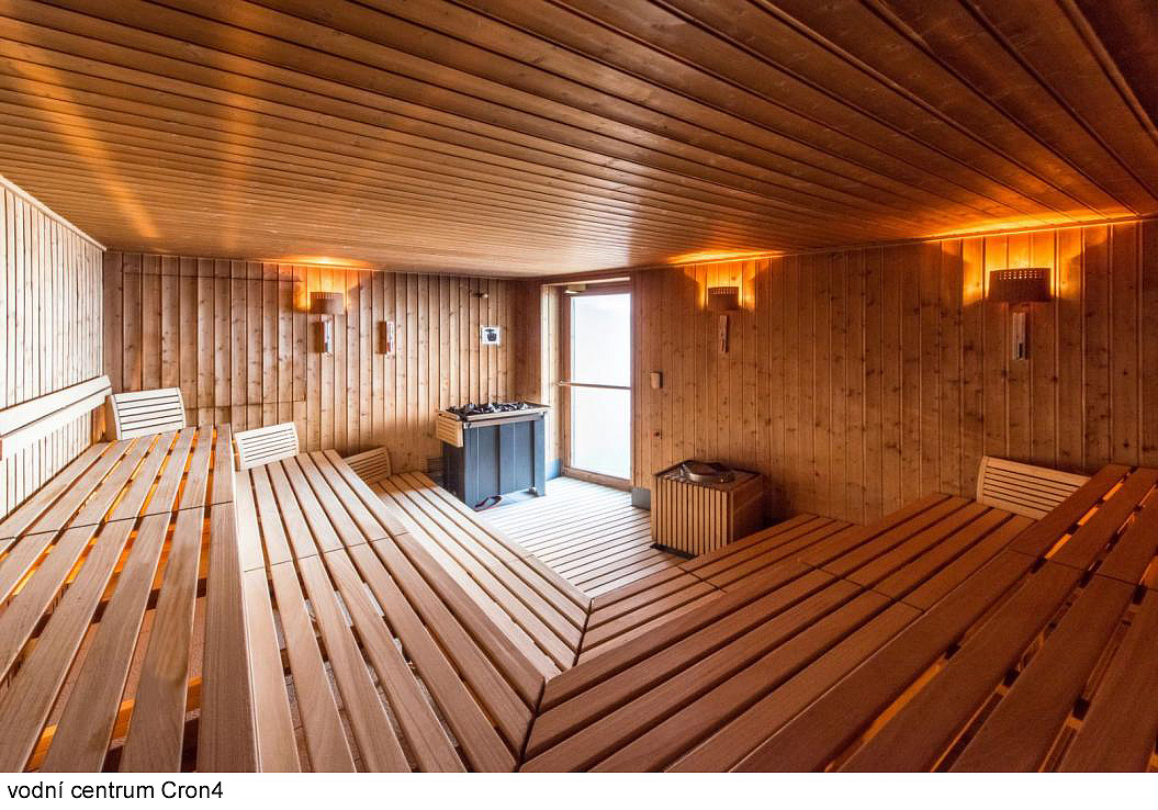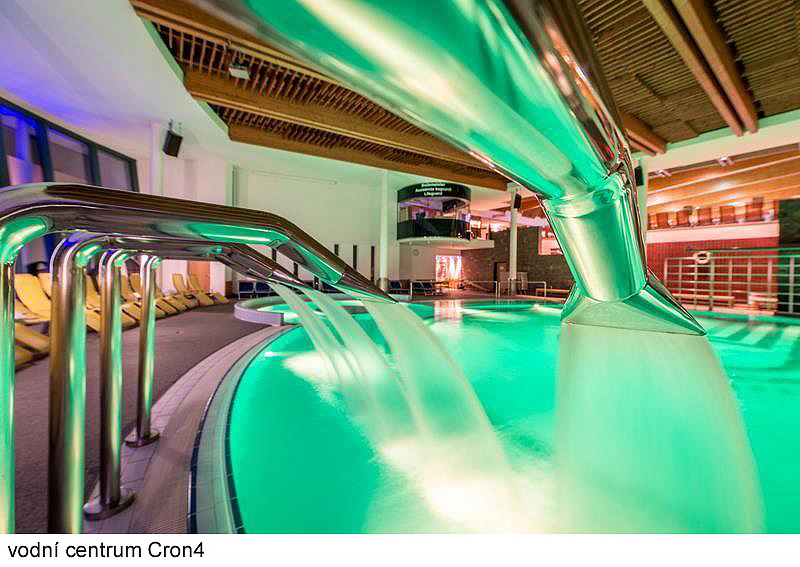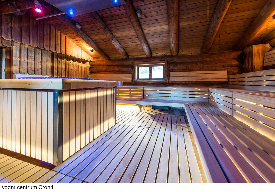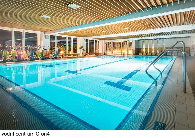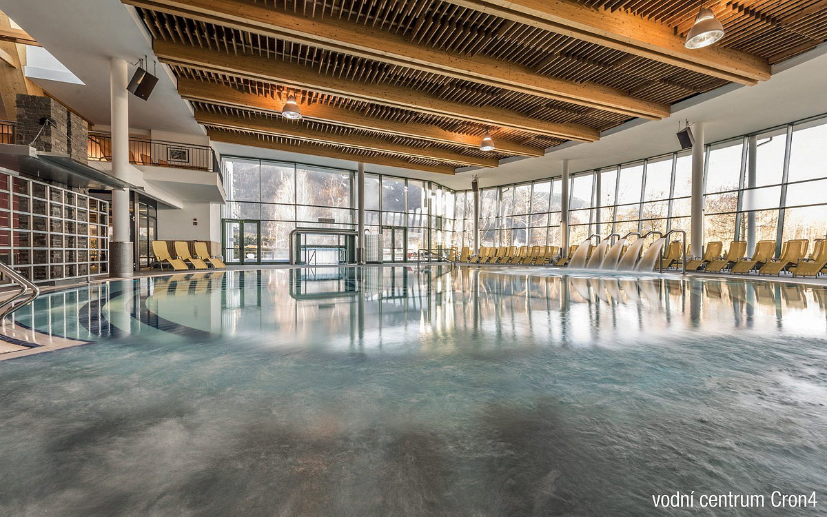 panoramatická sauna#, infrakabína#, 2x relaxačný kútik s ležadlami#, posilňovňa#; vodné centrum Cron4 - bazén 25 x 12 m, detský bazénik, bazén 115 m² so slanou vodou, vonkajší vyhrievaný bazén, 75 m dlhý tobogán; služby označené # môžu využívať osoby od 16 rokov