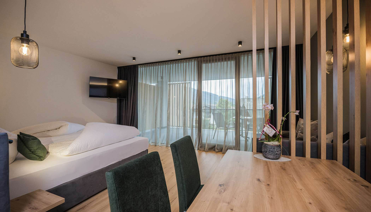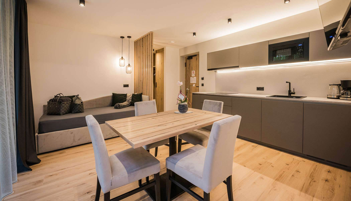 mono 4 Dolomiti - 31 až 37 m² – obývacia izba s kuchynským kútom, čiastočne oddelená manželská posteľ a rozkladací gauč pre 2 osoby, sociálne zariadenie, balkón