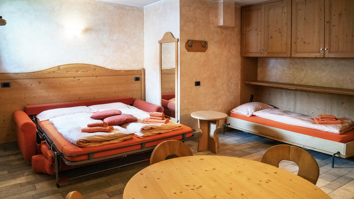 trilo 6/7 - dvojpodlažný apartmán; 1. poschodie – obývacia izba s kuchynským kútom a rozkladacím gaučom pre 2 osoby, sociálne zariadenie so sprchou, malý balkón; 2. poschodie – 1 spálňa s manželskou posteľou alebo 2 samostatnými lôžkami, 1 spálňa s 2/3 samostatnými lôžkami, sociálne zariadenie so sprchou; vchod do apartmánu z 1. poschodia