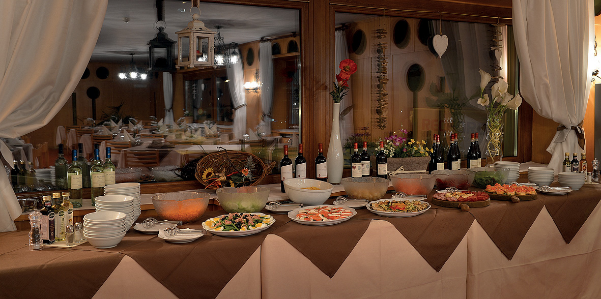 servírované menu s výberom z 3 teplých predjedál a 3 hlavných jedál s prílohou, studené predjedlá formou bufetu, menší šalátový bufet, servírovaný dezert, nápoje za poplatok