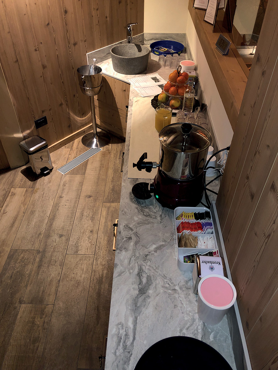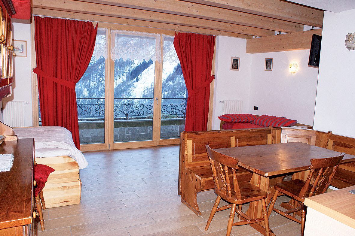1 spálňa s manželskou posteľou, 1 spálňa bez okna s poschodovou posteľou a 1 samostatným lôžkom, obývacia izba s rozkladacím gaučom pre 2 osoby; novo zrekonštruovaný apartmán so samostatným vchodom v zadnej apartmánovej časti hotela; malá vstupná zimná záhrada (vlastná lyžiareň)