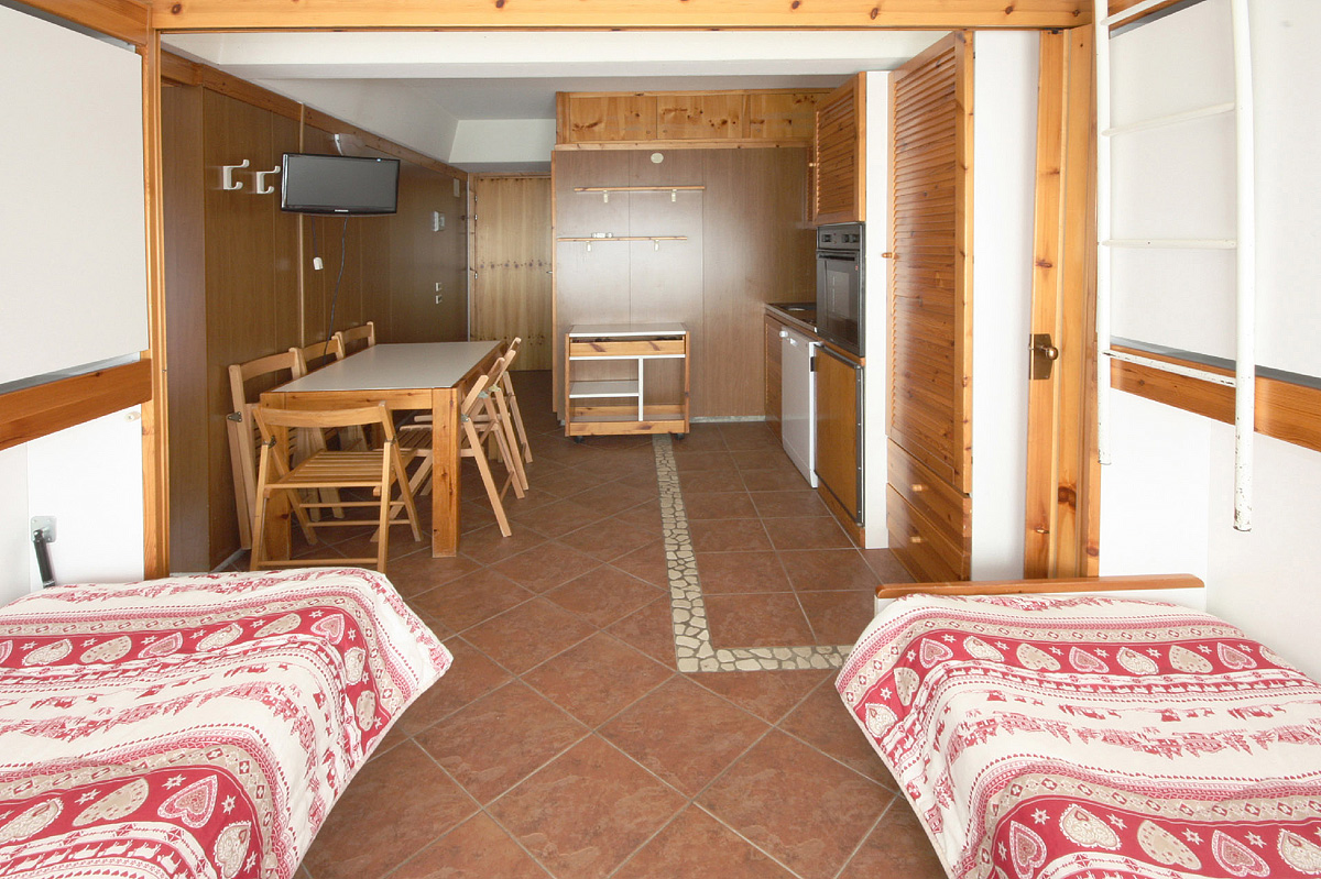 mono 2+1 - obývacia izba s kuchynským kútom, spravidla so skriňovou vyklápacou manželskou posteľou a prístelkou pre 1 osobu, sociálne zariadenie s vaňou; odporúčaná maximálna obsadenosť sú 2 dospelí a 1 dieťa do nedovŕšených 10 rokov