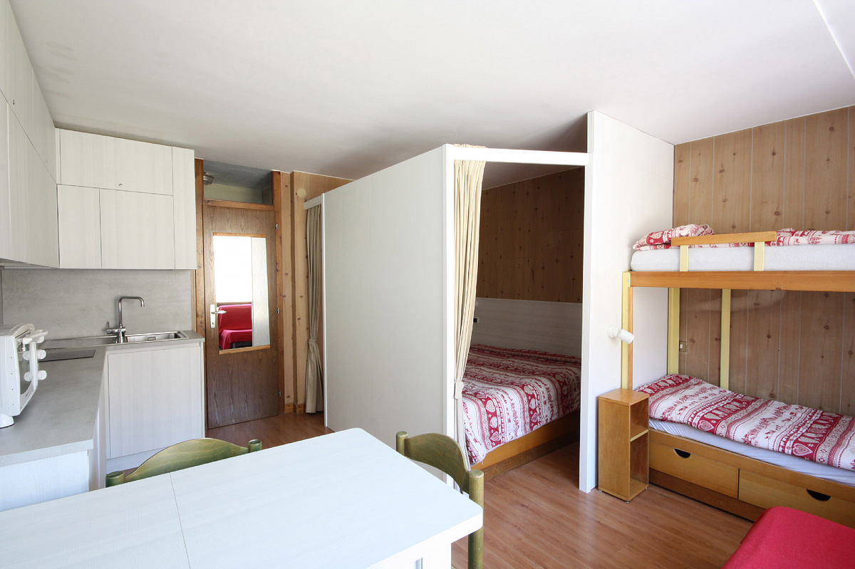 obývacia izba s kuchynským kútom, rozkladacím gaučom či manželským lôžkom pre 2 osoby, poschodová posteľ či rozkladací gauč typu zásuvka pre 1 či 2 osoby, sociálne zariadenie