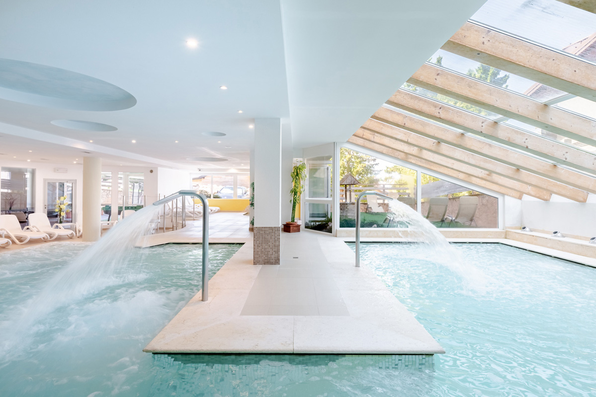 bazén 104 m² atypického tvaru s protiprúdom, umelým vodopádom a lehátkami, detský bazénik 10 m² s lehátkami, vírivka až pre 9 osôb, sauna, aromatická sauna, para, termárium, 4x multifunkčná sprcha, horizontálne solárium*, relaxačný kútik s lehátkami, Kneippov chodník, masáže*, kozmetické služby*, posilňovňa